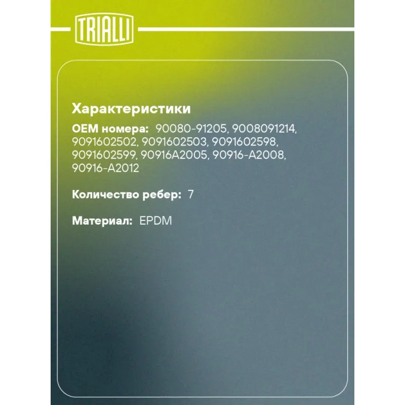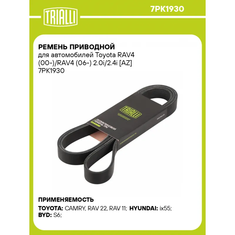 Ремень приводной для автомобилей Toyota RAV4 (00-)/RAV4 (06-) 2.0i/2.4i [AZ] Характеристики: Артикул: 7PK1930 OEM номера: 90080-91205, 9008091214, 9091602502, 9091602503, 9091602598, 9091602599, 90916A2005, 90916-A2008, 90916-A2012 Материал: EPDM Количество ребер: 7 Длина, мм.: 1930 Гарантийный срок: 2 года/60 000 км. Количество... Читать полностью →