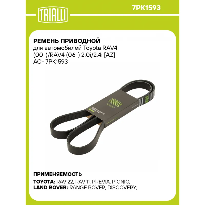 Ремень приводной для автомобилей Toyota RAV4 (00-)/RAV4 (06-) 2.0i/2.4i [AZ] AC- Характеристики: Артикул: 7PK1593 OEM номера: 9091602491, 9091602494, 9091602596, 9091602597 Материал: EPDM Количество ребер: 7 Длина, мм.: 1593 Гарантийный срок: 2 года/60 000 км. Товарная линейка: BLACK Количество на автомобиль: 1 Комплектация: ... Читать полностью →