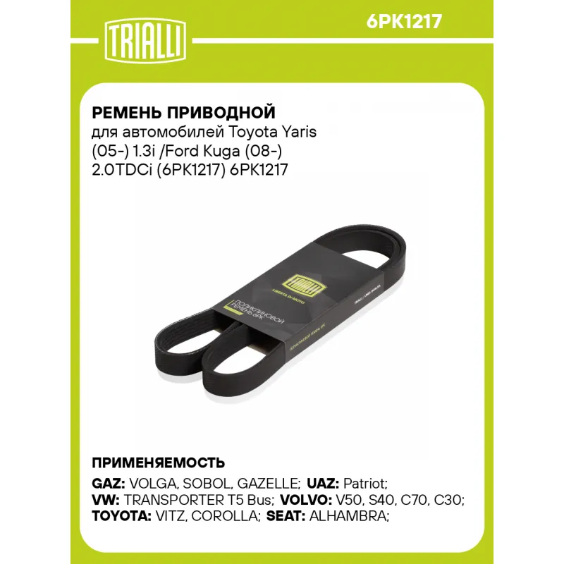 Ремень приводной для автомобилей Toyota Yaris (05-) 1.3i /Ford Kuga (08-) 2.0TDCi (6PK1217) Характеристики: Артикул: 6PK1217 OEM номера: 5750PG, 5750RE, 5750XN, 5750LE, 5750RC, 9655945780, 1231960, 1253937, 4M5Q6C301EB, 1438244, 1712212, 4M5Q6C301EC, 4M5Q6C301EA, 4M5Q6C301MA, 4M5Q6C301FC, 5802102048, 504092335, MD350259, MD363300, MD365196, ME24167, 117204171R, 11720-CK80A, 11720CK90A, 1340021, 55573152, 13 40 010, 96506860, 9650686080, 96559457, 7701065088, 1172 061 70R, 9936C1220, 90916-02604, 9091602706, 99366C1220, 30777660, 8670068, 9670068, 406.1308020-11, 406.1308020-12, 25212-04630, 4061308020-13, 406.1308020-14, 55568859 Количество на автомобиль: 1 Длина, мм.: 1217 Количество ребер: 6 Материал: EPDM Товарная линейка: BLACK Комплектация: Ремень поликлиновой - 1 шт Гарантия: от 1 года.