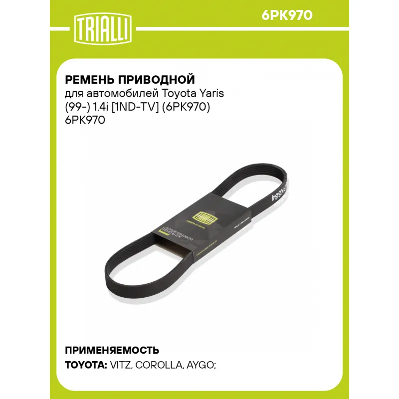 Ремень приводной для автомобилей Toyota Yaris (99-) 1.4i [1ND-TV] (6PK970) Характеристики: Артикул: 6PK970 OEM номера: 99366-C0970, 90916-W2001, 570623126323, PY01-15-909 Количество на автомобиль: 1 Длина, мм.: 970 Количество ребер: 6 Материал: EPDM Товарная линейка: BLACK Комплектация: Ремень поликлиновой - 1 шт Гарантия: от 1 года.