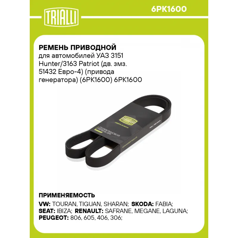 Ремень приводной для автомобилей УАЗ 3151 Hunter/3163 Patriot (дв. змз. 51432 Евро-4) (привода генератора) (6PK1600) Характеристики: Артикул: 6PK1600 OEM номера: 04792070AB, 04892173AA, 5080313AB, A6649970092, 8980100450, 149971892, A0149971892, 0149971892, 6340673, 6340668, 1340683, 98010045, 5750 R7, 9632391980, 96294079, 9629407980, 9630034080, 96300342, 9632600080, 9652391980, 132162600, 25212 2JTA0, 047903137AC, 05080313AB, 03C903137A, 03L 903 137 A, 3682687, 10166330, 51432-1308020, 980100450, 97324297 Количество на автомобиль: 1 Длина, мм.: 1600 Количество ребер: 6 Материал: EPDM Товарная линейка: BLACK Комплектация: Ремень поликлиновой - 1 шт Гарантия: от 1 года.