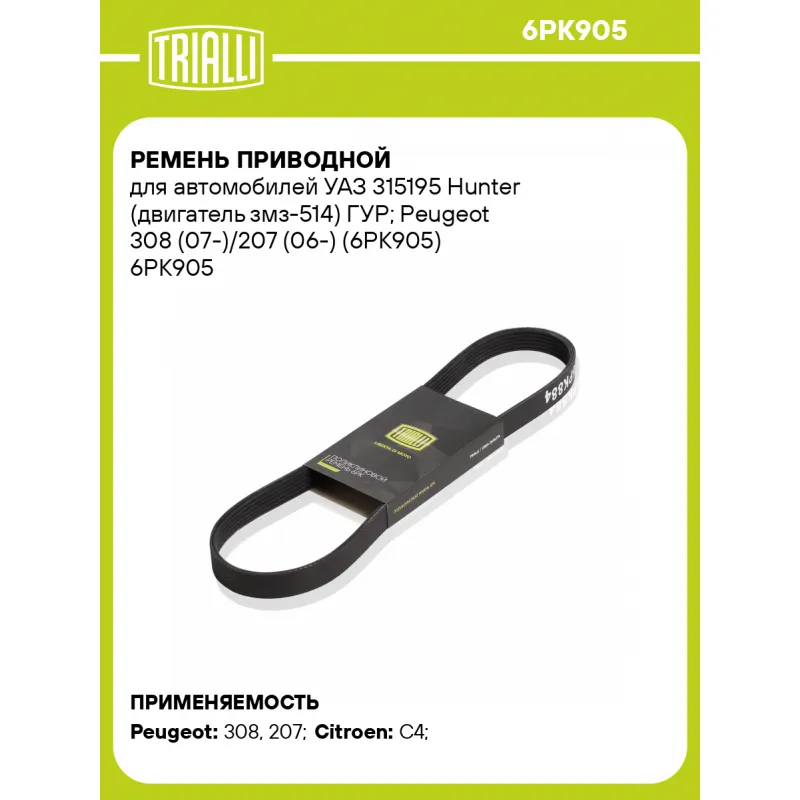 Ремень приводной для автомобилей УАЗ 315195 Hunter (двигатель змз-514) ГУР; Peugeot 308 (07-)/207 (06-) (6PK905) Характеристики: Артикул: 6PK905 OEM номера: 038903137G, 38903137, 3151-48-1308020-371, 1340A155, 5750RG Количество на автомобиль: 1 Длина, мм.: 905 Количество ребер: 6 Материал: EPDM Товарная линейка: BLACK Подходит для авто: Peugeot 308 (07-), 207 (06-) Citroen C4 (10-), C4 (04-) Для проверки применяемости отправьте VIN автомобиля через вкладку "Есть вопросы о товаре?" Комплектация: Ремень поликлиновой - 1 шт Гарантия: от 1 года.