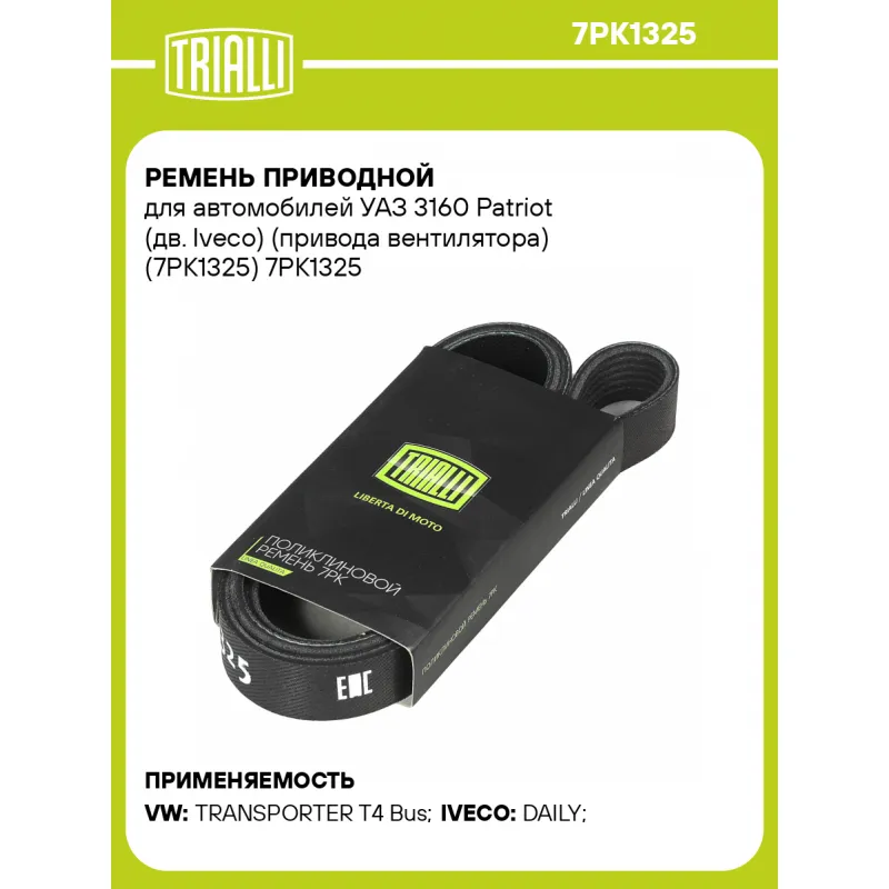 Ремень приводной для автомобилей УАЗ 3160 Patriot (дв. Iveco) (привода вентилятора) (7PK1325) Характеристики: Артикул: 7PK1325 OEM номера: 6000616601, 504000413, 5802102050, 622 993 01 00, A 622 993 01 00, 11720-1261R, 4423076, 95517887, 021145933J, 934 528 89, 316300100802001 Количество на автомобиль: 1 Длина, мм.: 1325 Количес... Читать полностью →