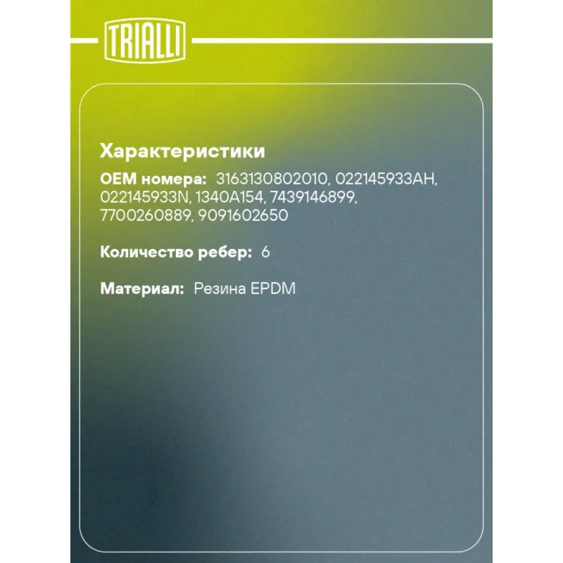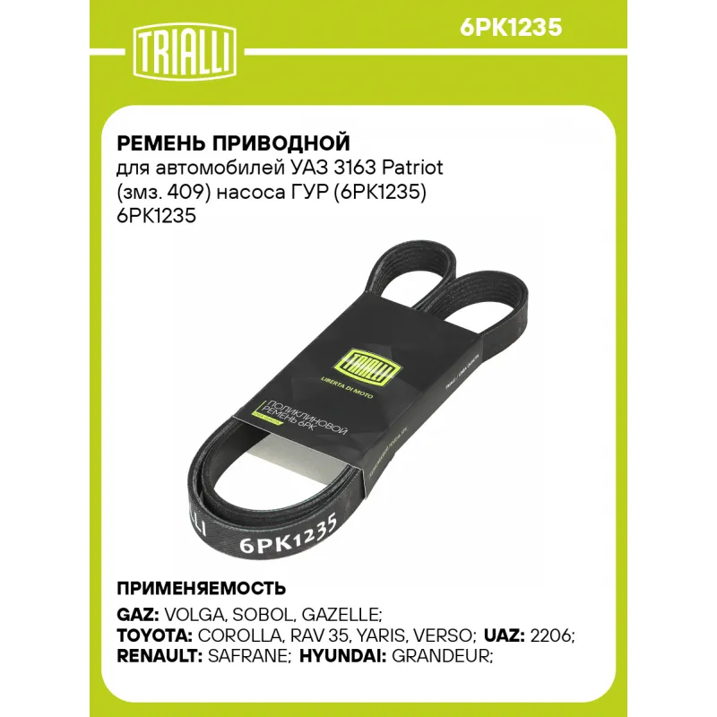 Ремень приводной для автомобилей УАЗ 3163 Patriot (змз. 409) насоса ГУР (6PK1235) Характеристики: Артикул: 6PK1235 OEM номера: 3163130802010, 022145933AH, 022145933N, 1340A154, 7439146899, 7700260889, 9091602650 Количество на автомобиль: 1 Длина, мм.: 1235 Количество ребер: 6 Материал: Резина EPDM Товарная линейка: BLACK Комплектация: Ремень поликлиновой - 1 шт Гарантия: от 1 года.