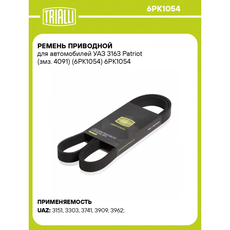 Ремень приводной для автомобилей УАЗ 3163 Patriot (змз. 4091) (6PK1054) Характеристики: Артикул: 6PK1054 OEM номера: 11281497435, 11287526364, 11287518251, 1497435, 7526364, 5750PN, 5750WY, 96533196, 9653319680, 5750PL, 71719644, 46803270, 55194752, 46801955, 55200255, 1097332, 92SF6C301A2A, 95VW6C301CB, 1094854, 500368902, 500324346, ZZMC18381, 6340619, 6340663, 93179102, 93181138, 5010284906, 5010437106, 5010437598, 5010437648, 1752179J50, 90916-02374, 9936601050, 9936621050, 9936671050, 99366-81050, 028903137AS, 06F260849L, 03G903137B, 3095880, 4060415, 981634, 9091602373, 6PK1054, 3163-1308020-275, 4091-1308020 Количество на автомобиль: 1 Длина, мм.: 1054 Количество ребер: 6 Материал: EPDM Товарная линейка: BLACK Подходит для авто: УАЗ 3151 (85-), 3303, 3741, 3909, 3962, Hunter (УАЗ-315195) (03-) Для проверки применяемости отправьте VIN автомобиля через вкладку "Есть вопросы о товаре?" Комплектация: Ремень поликлиновой - 1 шт Гарантия: от 1 года.