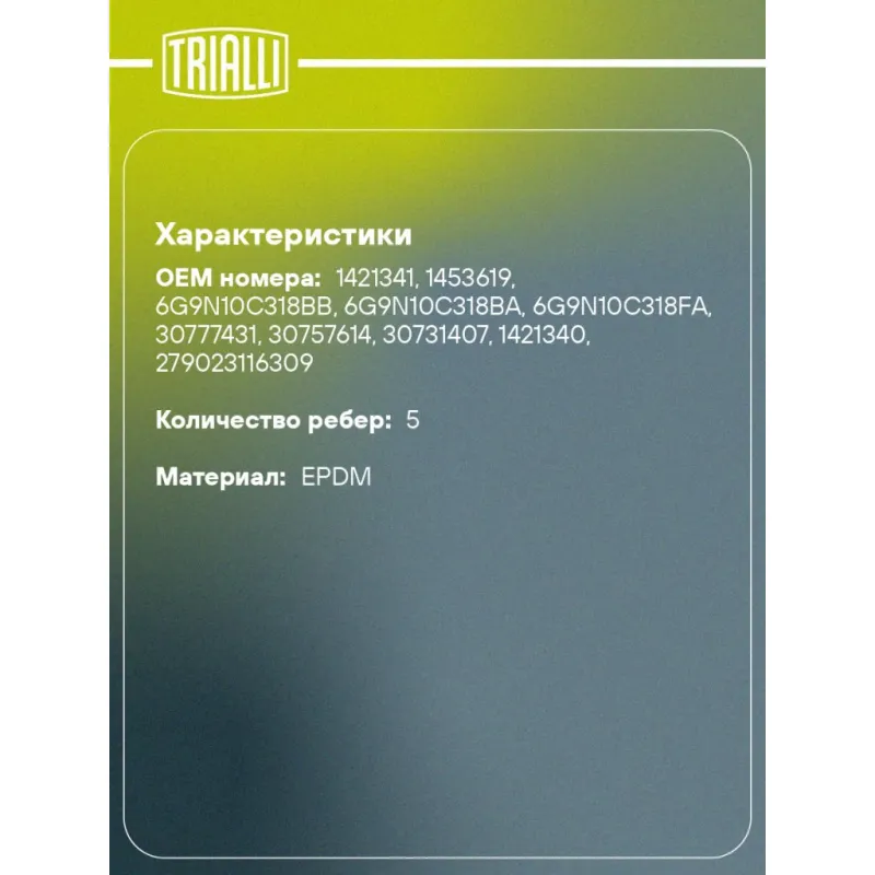 Ремень приводной для автомобилей Volvo S80 (06-)/S60 (10-)/Ford Mondeo IV (07-)/S-Max (06-) 2.5iT (5PK1094) Характеристики: Артикул: 5PK1094 OEM номера: 1421341, 1453619, 6G9N10C318BB, 6G9N10C318BA, 6G9N10C318FA, 30777431, 30757614, 30731407, 1421340, 279023116309 Количество на автомобиль: 1 Длина, мм.: 1094 Количество ребер: 5 Материал: EPDM Товарная линейка: BLACK Номера аналоги:: 5PK1092, 5PK1093, 5PK1094, 5PK1095, 5PK1096 Подходит для авто: Volvo S80 II (06-), V70 (07-) Ford Mondeo IV (07-), S-Max (06-) Для проверки применяемости отправьте VIN автомобиля через вкладку "Есть вопросы о товаре?" Комплектация: Ремень поликлиновой - 1 шт Гарантия: от 1 года.