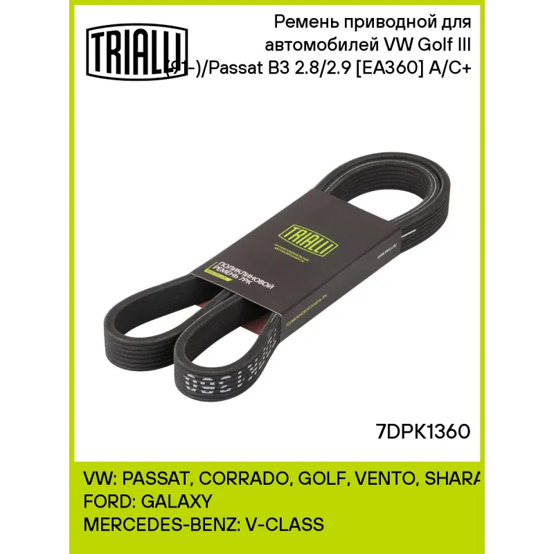 Ремень приводной для автомобилей VW Golf III (91-)/Passat B3 (91) 2.8/2.9 [EA360] A/C+ Характеристики: Артикул: 7DPK1360 OEM номера: 7198536, 95VW6C301KA, 0119977192, A0119977192, 021145933D, 021145933H, 119977192, 021145933P Материал: EPDM Количество ребер: 7 Длина, мм.: 1360 Количество на автомобиль: 1 Товарная линейка: BLACK Комплектация: Ремень поликлиновой - 1 шт Гарантия: от 1 года.