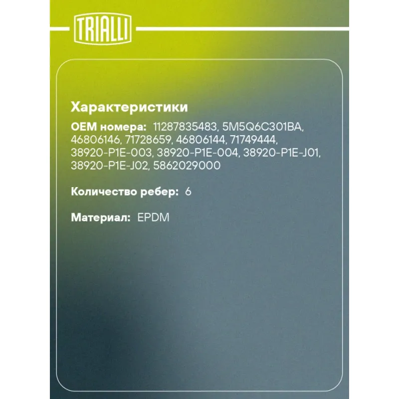 Ремень приводной для автомобилей VW Polo Sedan (RUS) (10-)/Skoda Octavia A5 (04-) 1.4TSi/1.6FSi A/C- (6PK1090) Характеристики: Артикул: 6PK1090 OEM номера: 11287835483, 5M5Q6C301BA, 46806146, 71728659, 46806144, 71749444, 38920-P1E-003, 38920-P1E-004, 38920-P1E-J01, 38920-P1E-J02, 5862029000, 5862029010, 8943801580, 11920-9F615, 5750.YJ, 6Q0903137A, 04L145933, 036145933F, 06Q903137A, 6Q0903137C, 3064404, 3805922, B016584 Количество на автомобиль: 1 Длина, мм.: 1090 Количество ребер: 6 Материал: EPDM Товарная линейка: BLACK Комплектация: Ремень поликлиновой - 1 шт Гарантия: от 1 года.