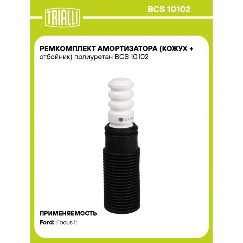 Ремкомплект амортизатора (кожух + отбойник) полиуретан Характеристики: Артикул: BCS 10102 OEM номера: 33 35 3 135 624, 33 53 1 135 624, 33 35 3 136 395, 33 53 1 136 395, 33 35 3 092 475, 33 53 1 092 475, 33 50 6 757 368, 33 53 6 757 368, 33 53 1 131 481, MB809285, 51792434, 46816908, 51702991, 1370318, 1321003, 1458447, 1700722, 1323629, 2170810, 8V41-5K619-AB, 98AG-5K570-AH, AV61-5K619-BA, BV61-5K619-AA, 4M515K570BA, 3N61 5K570 AA, 1713375, 1064097, 1070176, 1073486, 1517641, 4M51-5K570-AA, 52722-SX1-003, 52722-SM4-013, 52722-SM4-003, 52722-SV1-A02, 52722-SM4-A02, 52748-SM4-014, 52748SM4000, 52722SM4A01, 52722SM1A02, 52722SM1A00, 52748SM4004, 51840914, BBM2-28-910D, BBM2-28-910D SK, BBM2-28-910E, BBM2-28-910E SK, BBM2-28-910F, BBM2-28-910F SK, GHK5-28-910D, GHP9-28-1A0, B45A-28-1A0, GHK5-28-910F, GHK5-28-910G, GLK5-28-910D, GLY5-28-910A, KD35-28-1A0, KD45-28-910C, GHK5-28-910E, B45A-28-910A, B45A-28-910B, GHY5-28-910, DC20-28-111, D004-28-111A, D267-28-1A1A, KD45-28-910E, KDY6-28-910, KDY6-28-910A, EH46-28-910A, EH4828910, EH4828910A, EH48-28-910B, EH6428910, EH64-28-910A, BGV4-28-910, BGV4-28-910SK, EG2328910C, EG2128910E, EG2128910F, EH4628910, MR369944, MR589326, 4060A047, MR369633, 04 36 955, 436955, 1376386080, 4F0 512 131 A, 1K0 511 353Q, 30635296, 30666243, 13251764, 55326-1C000, 55326-1E000, 55326-0M000, 55326-07100, 55326-1G000, 8D0 512 131, 8K0 512 131 D, 4B0 512 131 B, 8K0 512 131 A, 8K0 512 131 J, 8K0512131A/J, 1K0 511 359, 5Q0 511 351 E, 5Q0 511 357 N, 3C0 511 359B, 6K0 512 131, 6K0 512 131A, 6K0 512 131B, 867512131, 6X0 512 131 C, 6X0 512 131A, 115350331, 6Q0 512 131C, 1S0 511 351 B, 5Q0 511 357 P, 5Q0 511 357 J, 8J0 511 353 F, 8J0 511 353 G, 3C0 511 359 A, 5Q0 511 357 M, 6U0 512 131, 6U0 512 131 B, 8T0 513 029 A, 1K0 511 353 F, 8F0 512 131 A, 5Q0 511 353 P, 5Q0 511 357 L, 5Q0 511 357 H, 8E0 512 131P, 1K0 511 353S, 8K0 512 131K, 8T0 513 028 AB, 8T0 513 028 R, 8T0 513 029, 8D5 512 131F, 8D9 512 131 A, 1J0 512 131C, 8N0 512 011 AF, 8N0 512 011 G, 6Q0 512 131B, 1J0 512 131B, 1K0 511 353J, 1K0 511 353N, 8A9 512 131 A, 8D5 512 131 A, 8D5 512 131 D, 8V0 511 358A, 5Q0 511 358 D, 5Q0 511 358 G, 3C0 511 359 D, 4M0 512 131, 8W0 512 131 G, 8K0 512 131 B, 8D0 512 131 E, 1K0 511 353, 8F0 512 131 E, 8F0 512 131 G, 5Q0 511 357 G, 90538996, 68427877AA, 55701429 Товарная линейка: BLACK Количество на автомобиль: 2 Материал: Пенополиуретан/Термоэластопласт Внутренний диаметр отбойника, мм: 10 Высота отбойника, мм: 102 Гарантийный срок: 2 года/60 000 км Подходит для авто: Ford Focus I (98-) Для проверки применяемости отправьте VIN автомобиля через вкладку "Есть вопросы о товаре?" Комплектация: Пылезащитный кожух (пыльник) - 1 шт Отбойник (буфер) - 1 шт Гарантия: от 1 года.