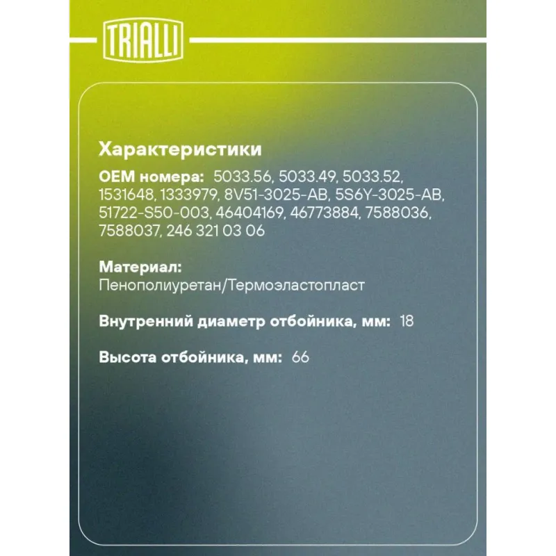 Ремкомплект амортизатора (кожух + отбойник) полиуретан Характеристики: Артикул: BCS 1866 OEM номера: 5033.56, 5033.49, 5033.52, 1531648, 1333979, 8V51-3025-AB, 5S6Y-3025-AB, 51722-S50-003, 46404169, 46773884, 7588036, 7588037, 246 321 03 06, A246 321 03 06, 55241-90J10, 03 44 424, 24403535, 344424, 03 44 412, 344412, 90375586, 5033.58, 9623030080, 82 00 591 288, 540500558R, 82 00 591 288 SK, 82 00 839 707, 82 00 839 707 SK, 42111-57KA0, 95214399, 54626-3X000, 54626-27000, 54626-4L000, 0K201 34 111A, 0K201 34 111, 96535006, 31 30 6 777 049 Товарная линейка: BLACK Количество на автомобиль: 2 Материал: Пенополиуретан/Термоэластопласт Внутренний диаметр отбойника, мм: 18 Высота отбойника, мм: 66 Гарантийный срок: 2 года/60 000 км Подходит для авто: Renault Duster (10-), Duster (10-) Для проверки применяемости отправьте VIN автомобиля через вкладку "Есть вопросы о товаре?" Комплектация: Пылезащитный кожух (пыльник) - 1 шт Отбойник (буфер) - 1 шт Гарантия: от 1 года.