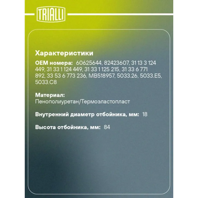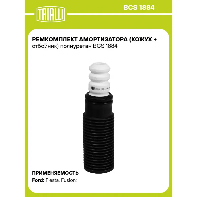 Ремкомплект амортизатора (кожух + отбойник) полиуретан Характеристики: Артикул: BCS 1884 OEM номера: 60625644, 82423607, 31 13 3 124 449, 31 33 1 124 449, 31 33 1 125 215, 31 33 6 771 892, 33 53 6 773 236, MB518957, 5033.26, 5033.E5, 5033.C8, 7521937, 46412047, 71742686, 51906291, 1792629, 51722-SAA-E02, 51722-SAA-G02, 51722-TF0014, 51722-SAA-E01, 51722-SAA-G01, 51722-SNA-904, 51722-SNA-905, 51722-SVA-A02, 51722-SVA-A03, 51722-SVA-A04, 51722-TR0-A01, 7778945, C100-34-111A, B25D-34-111A, B01C-34-111, 1683230844, A1683230844, 9151964280, 5033.86, 9651502280, 5033.53, 5033.60, 9633324380, 96 821 618 80, 5033.74, 96 485 283 80, 54 05 051 77R, 54 05 037 01R, 48341-20210, 54626-1C000, 54626-29100, 54626-1C500, 54626-1M000, 0K2SA 34 111, 0K2SA 28111, 357 412 303 F, 6K0413031B, 6Q0 412 301, 5443152, 115450331, 6U6 412 303, 96549918, 51939952, K68254817AA, 68254817AA Товарная линейка: BLACK Количество на автомобиль: 2 Материал: Пенополиуретан/Термоэластопласт Внутренний диаметр отбойника, мм: 18 Высота отбойника, мм: 84 Гарантийный срок: 2 года/60 000 км Подходит для авто: Ford Fiesta (01-), Fusion (02-), Fiesta (01-), Fusion (02-) Для проверки применяемости отправьте VIN автомобиля через вкладку "Есть вопросы о товаре?" Комплектация: Пылезащитный кожух (пыльник) - 1 шт Отбойник (буфер) - 1 шт Гарантия: от 1 года.