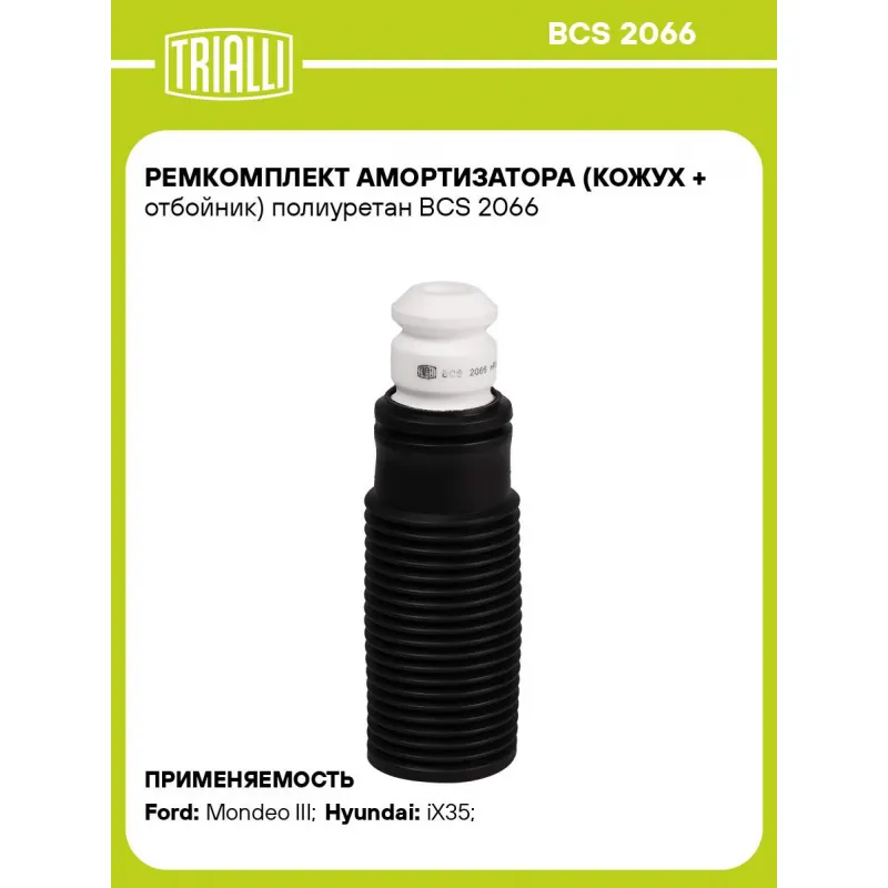Ремкомплект амортизатора (кожух + отбойник) полиуретан Характеристики: Артикул: BCS 2066 OEM номера: 51775545, 51866009, 60683276, 31 30 6 774 232, 31 33 6 773 795, 31 33 6 777 636, 5033.E2, 5033.F2, 51885856, 51921446, 51983725, 1446481, 1S7W 3025 AE, 4453803, 1474352, 7G91-3K100-DAA, 1672994, 6M5Y-3K100-AC, 3M513K100BC, 3M513K100BD, 3M513K100BE, 3M513K100BF, BV613K100AA, BV613K100BA, 1S71-3025-AC, 1S71-3025-AD, DG9C-3K100-DXA, DG9C-3K100-DXB, 3M513K100BA, 3M513K100BB, 6G91-3K100-AAB, 6G913K100AAA, 8V413K100AB, AV61-3K100-AC, AV61-3K100-AD, 1S71-3025-AB, 1468902, 1710056, 1740047, 1307842, 1S7W-3025-AD, 1346600, 1859504, 1230954, 1250821, 1255351, 1307350, 1346599, 1507578, 1682703, 1689512, 1116577, 1118919, 1123541, 9G91-3K100-AAA, 1377255, 1406413, 1866985, 1866984, 1791354, 51722-SMG-E04, 51722-SMG-E01, 51722-SMG-E02, 51722-SMG-E03, 51722-TV0-E02, 51610-SMG-305, 2110-2912622, BBM2-34-111, GA2A-34-111, BP4K-34-111B, BP4K-34-111C, BP4K-34-111A, 1693230192, A1693230192, MR961000, 55241-98J00, 54050-HA00A, 13197623, 03 44 417, 03 44 651, 344426, 03 44 401, 03 44 411, 344411, 344401, 3 44 651, 13424963, 344417, 12786062, 1449757, 20321-AA201, 20321-AA200, 20371-AC000, 20371-AC001, 42111-61M00, 48331-06100, 48341-06050, 3073 642 4, 3076 040 5, 31340308, 30736505, 31277535, 31302678, 31329287, 30794010, 54626-A7000, 54626-3D000, 54626-A6000, 54626-1H000, 8Z0 412 301, 1KD 412 303, 8K0 412 131 G, 5N0 412 303 C, 5Q0 412 303 B, 1K0 412 303 B, 1H0 412 303 B, 5Q0 412 303 A, 5QD 412 303, 6N0 412 303A, 3C0 412 303 A, 90279302, 90112571, 90468644, 96549925, 90142884, 96225882, 51941991, K68254422AA, 31 33 6 859 768, 31 33 6 767 333, 31 33 6 760 693, 31 33 6 778 545, 31 33 6 859 766 Товарная линейка: BLACK Количество на автомобиль: 2 Материал: Пенополиуретан/Термоэластопласт Внутренний диаметр отбойника, мм: 20 Высота отбойника, мм: 66 Гарантийный срок: 2 года/60 000 км Подходит для авто: Ford Mondeo III (00-), Mondeo III (00-) Hyundai iX35 (10-), iX35 (10-), iX35 (10-), iX35 (10-) Для проверки применяемости отправьте VIN автомобиля через вкладку "Есть вопросы о товаре?" Комплектация: Отбойник (буфер) - 1 шт Пылезащитный кожух (пыльник) - 1 шт Гарантия: от 1 года.