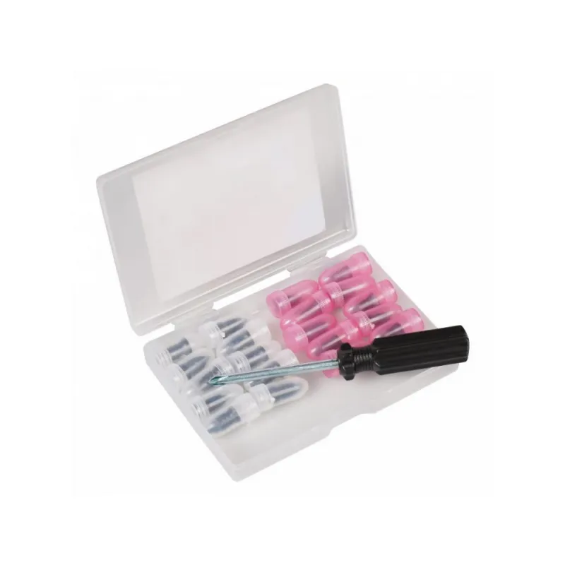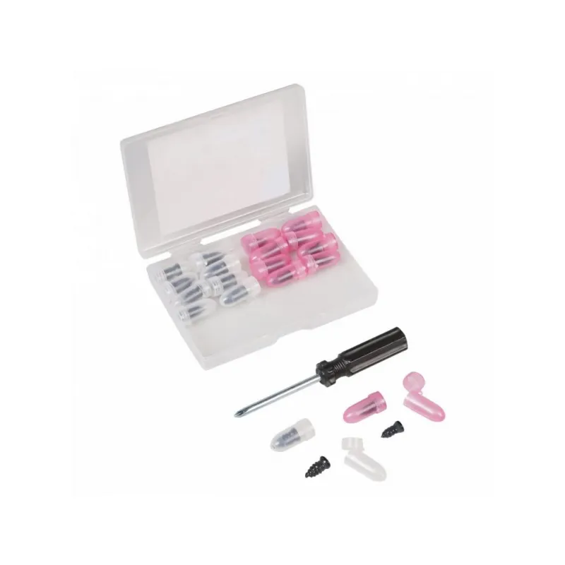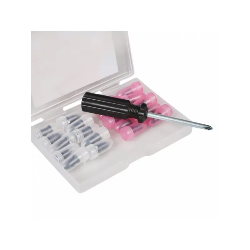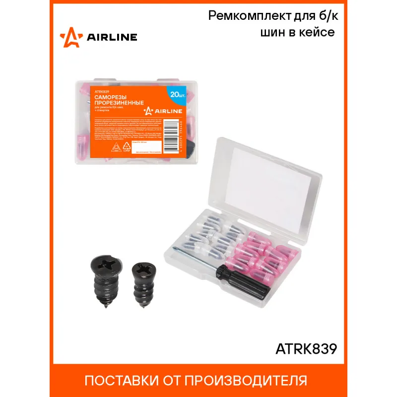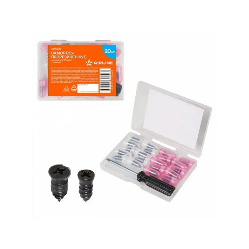 Ремкомплект для б/к шин в кейсе (саморезы прорезиненные 20 шт., отвертка) Описание: Саморезы для ремонта проколов помогут отремонтировать шину за пару минут без применения специальных инструментов и навыков. Определите место повреждения, удалите инородный объект, закрутите саморез в место прокола. За счет обрезиненного слоя саморезы плотно заполняют место повреждения и обеспечивают надежную герметизацию. В комплекте 10 саморезов 5,3*12мм и 10 саморезов 6*15мм, каждый в индивидуальном кейсе. Характеристики: Артикул: ATRK839 Размер саморезов 1, мм: 5,3*12 Размер саморезов 2, мм: 6*15 Комплектация: Саморезы 5.3*12 мм - 10 шт Саморезы 6*15 мм - 10 шт Отвертка - 1 шт Кейс - 1 шт Гарантия: от 1 года.