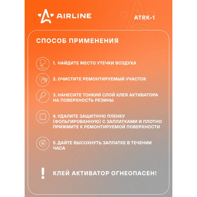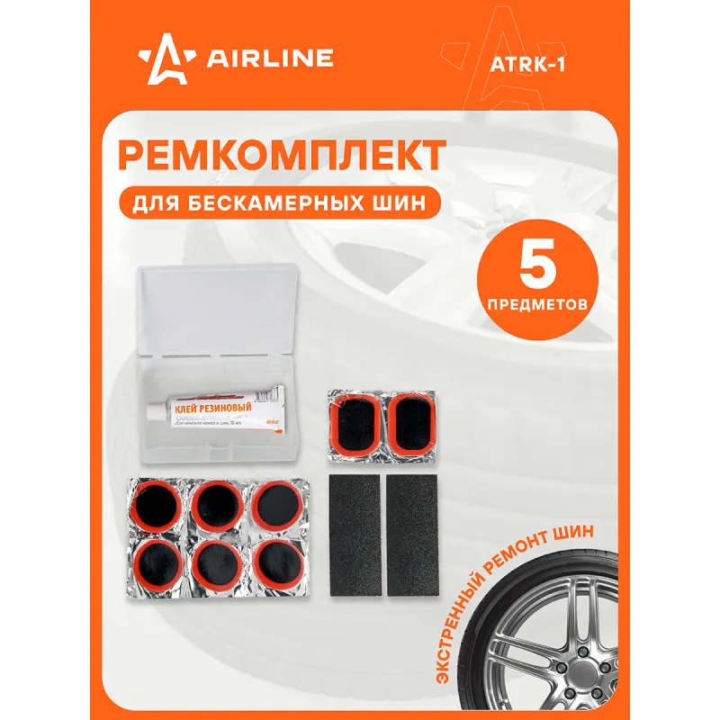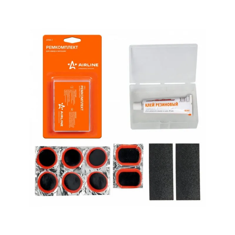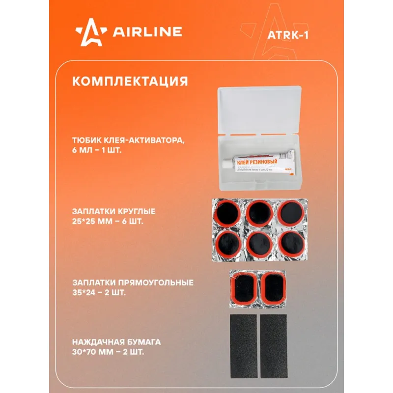 Ремкомплект для камер в кейсе (заплатки 25х25, н/ж бумага, клей-активатор) Описание: Ремонтный комплект поможет произвести экстренный ремонт бескамерных шин. Ремонтный комплект из серии AIRLINE предназначен специально для велосипедных шин и автомобильных камер. В комплекте представлены заплатки круглой и прямоугольной формы, наждачная бумага, необходимая для зачистки, а также тюбик клея. Принадлежности хранятся в пластиковом кейсе, в котором удобно хранить и транспортировать весь комплект. Применение: 1. Найдите место утечки воздуха. 2. Очистите ремонтируемый участок. 3. Нанесите тонкий слой клея-активатора на поверхность резины. 4. Удалите защитную пленку с заплатки и плотно прижать к ремонтируемой поверхности. 5. Дайте высохнуть заплатке в течение 1 часа и машина готова, можно ехать! Этот ремонтный комплект является незаменимым помощником в экстренных ситуациях и подходит для ремонта шин различных видов транспортных средств (автомобилей, велосипедов, мотоциклов и других шин), станет отличным подарком другу, мужу, каждому автомобилисту. Характеристики: Артикул: ATRK-1 Объем клея, мл: 6 Диаметр заплатки 1, мм: 25 Длина заплатки 2, мм: 35 Ширина заплатки 2, мм: 24 Комплектация: Заплатки круглые из сырой резины 25*25 мм - 6 шт Заплатки прямоугольные из сырой резины 35*24 мм - 2 шт Тюбик клея-активатора, 6 мл - 1 шт Наждачная бумага 30*70мм - 2 шт Пластиковый кейс - 1 шт Блистер односторонний - 1 шт Гарантия: от 1 года.