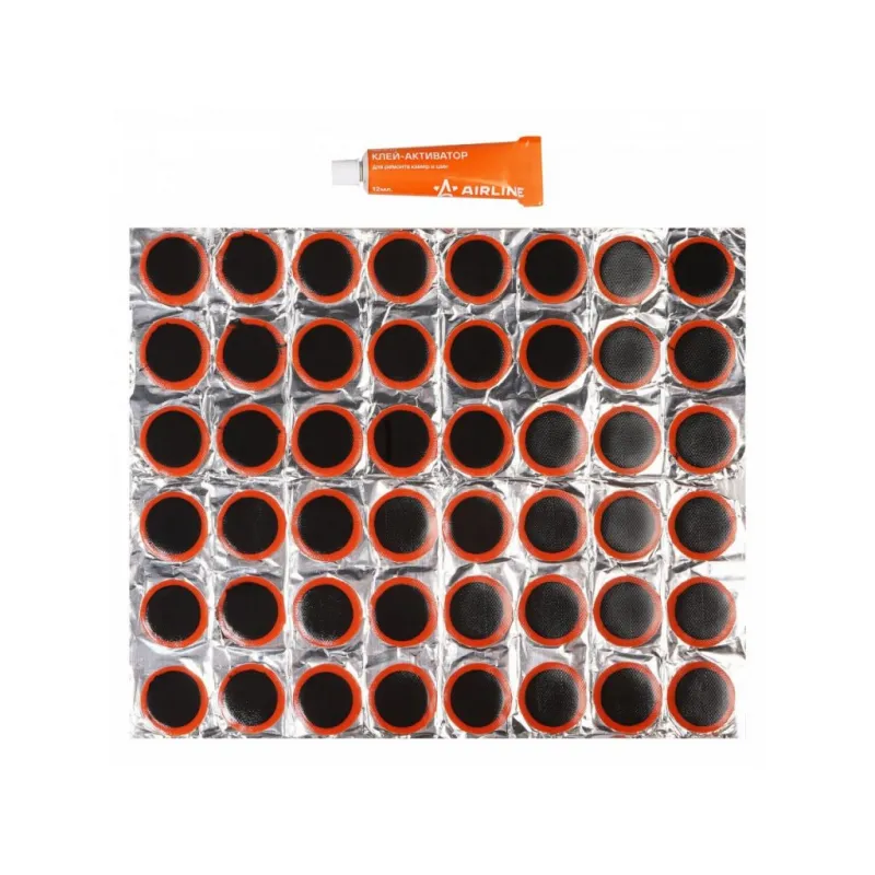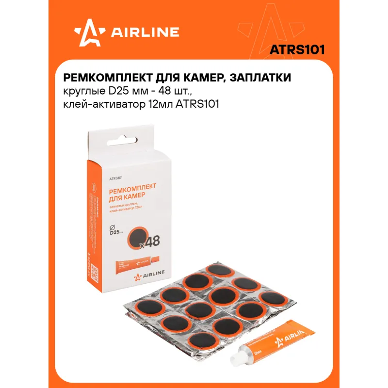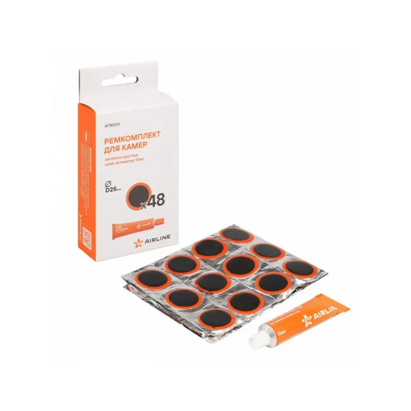 Ремкомплект для камер, заплатки круглые D25 мм - 48 шт., клей-активатор 12мл Описание: Резиновые латки для ремонта камер велосипеда и автомобиля 48 шт + клей активатор 12 мл AIRLINE ATRS101 - универсальный ремкомплект для самостоятельного ремонта и ремонта в автомастерских резиновых камер и шин автомобилей, быстрый и эффективный ремонт проколов, порезов, мелких пробоин. Заплатки круглые D25 мм. Ремонтный комплект предназначен для быстрого ремонта автомобильных и велосипедных камер. Применение: 1. Найдите место утечки воздуха. 2. Очистите ремонтируемый участок. 3. Нанесите тонкий слой клея-активатора на поверхность резины. 4. Удалите защитную пленку с заплатки и плотно прижать к ремонтируемой поверхности. 5. Дайте высохнуть заплатке в течение 1 часа. Этот ремонтный комплект является незаменимым помощником в экстренных ситуациях и подходит для ремонта шин/ камер различных видов транспортных средств (автомобилей, велосипедов, мотоциклов), станет отличным подарком другу, мужу, каждому автомобилисту. Такой ремонтный комплект всегда должен быть под рукой. Характеристики: Артикул: ATRS101 Диаметр заплаток, мм: 25 Объем клея, мл: 12 Комплектация: Заплатки - 48 шт Клей - 1 шт Коробка с подвесом - 1 шт Гарантия: от 1 года.