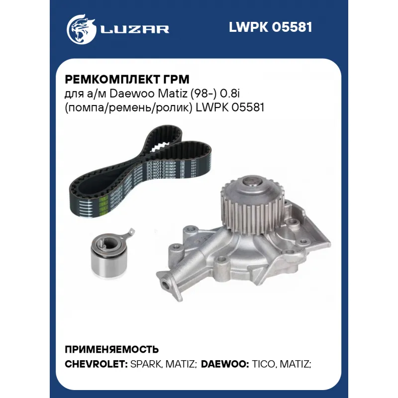 Ремкомплект ГРМ для а/м Daewoo Matiz (98-) 0.8i (помпа/ремень/ролик) Характеристики: Артикул: LWPK 05581 OEM номера: 1145A049, MD325854, MD340625, 12810-81401, 12810-81401, 12810-81402, 12810-81402, 1740070B00, 1740061810, 1740060D01, 1740050812, 12761A78B00, 12761A78B00000, 96352965, 96518977, 96563958, 96666219, 25194440, 94599007, 94599008, 12810A81400, 12810A81400, 12810A81400-000, 12810A81400-000, 94580139, 94580139, 1281081402000, 1276178B00, 12761-A78B00, 12761A-78B00-000, 12761A-80D00-000, 1281081402000, 12810-81400, 12810-81400, 12810-81401-000, 12810-81401-000 Количество на автомобиль: 1 Комплектация: Насос водяной - 1 шт Ролик ГРМ - 1 шт Ремень ГРМ - 1 шт Гарантия: от 1 года.