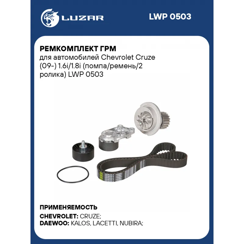 Ремкомплект ГРМ для автомобилей Chevrolet Cruze (09-) 1.6i/1.8i (помпа/ремень/2 ролика) Характеристики: Артикул: LWP 0503 OEM номера: 96352650, 96872702, 96182871, 96930074 Материал крыльчатки: Алюминиевый сплав Сопутствующий товар: Насосы водяные (помпы): LWP 0550 Комплектация: Насос водяной - 1 шт Ролик ГРМ - 2 шт Ремень ГРМ - 1 шт Гарантия: от 1 года.
