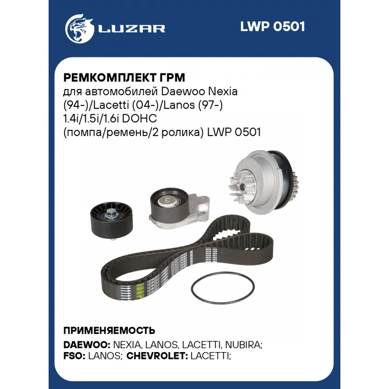 Ремкомплект ГРМ для автомобилей Daewoo Nexia (94-)/Lacetti (04-)/Lanos (97-) 1.4i/1.5i/1.6i DOHC (помпа/ремень/2 ролика) Характеристики: Артикул: LWP 0501 OEM номера: 94013802, 96351284, 96351971, 96352649, 96872700, 96990997 Количество на автомобиль: 1 Комплектация: Насос водяной - 1 шт Ремень ГРМ - 1 шт Ролик ГРМ - 3 шт Прокладка - 1 шт Гарантия: от 1 года.
