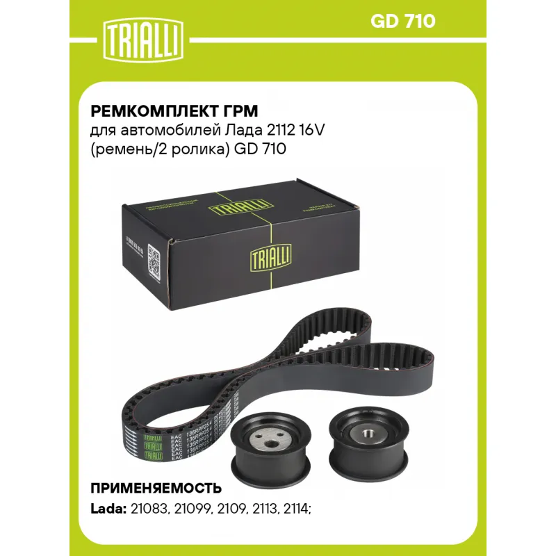 Ремкомплект ГРМ для автомобилей Лада 2112 16V (ремень/2 ролика) Характеристики: Артикул: GD 710 OEM номера: 2112-1006040, 2112-1006135, 2112-1006120, 21120-1006135-00, 21120-1006120-00, 21120-1006040-00, 21124-1006040, 21124-1006040-00 Сопутствующие товары:: GB 810, GT 910, CM 135, CM 120, CMS 120, CMS 135, CM 712 Особенности конструкции:: для 16V двигателей Гарантийный срок: 1 год/30 000 км. Ширина ремня ГРМ, мм.: 25,4 Количество зубьев ремня ГРМ: 136 Товарная линейка: BLACK Материал ремня ГРМ: CR Подходит для авто: ВАЗ 21083, 21099, 2109, 2113, 2114, 2115, Kalina (04-), 2110, 2111, 2112, Kalina (04-) Для проверки применяемости отправьте VIN автомобиля через вкладку "Есть вопросы о товаре?" Комплектация: Ремень ГРМ - 1 шт Ролик опорный - 1 шт Ролик натяжной - 1 шт Гарантия: от 1 года.