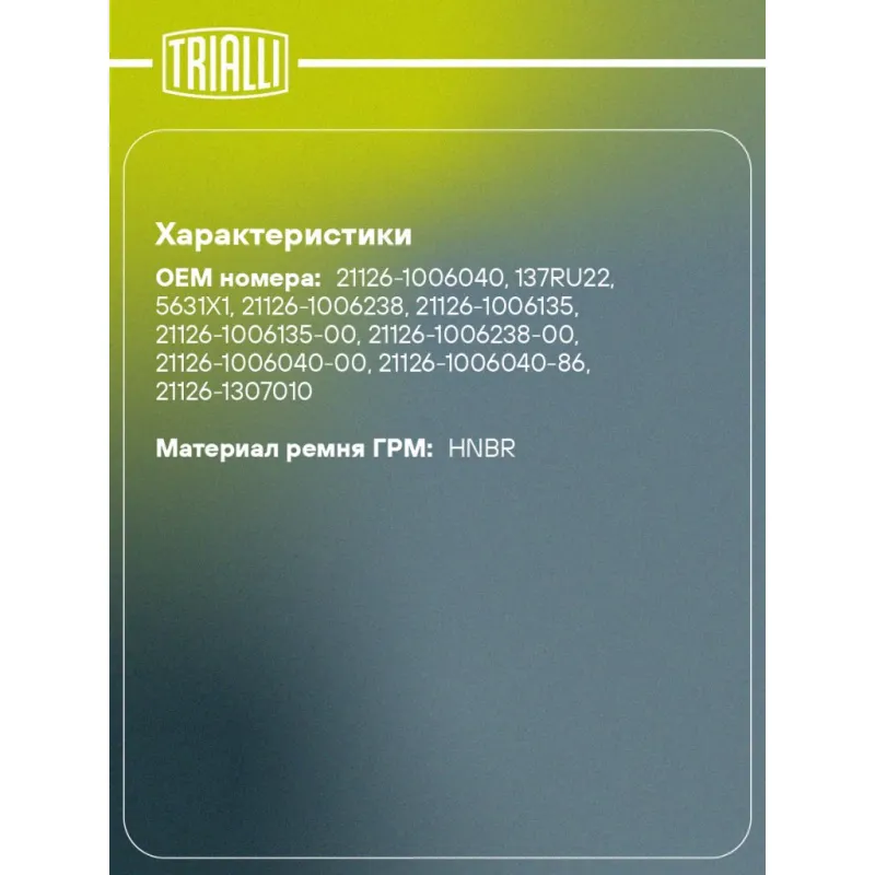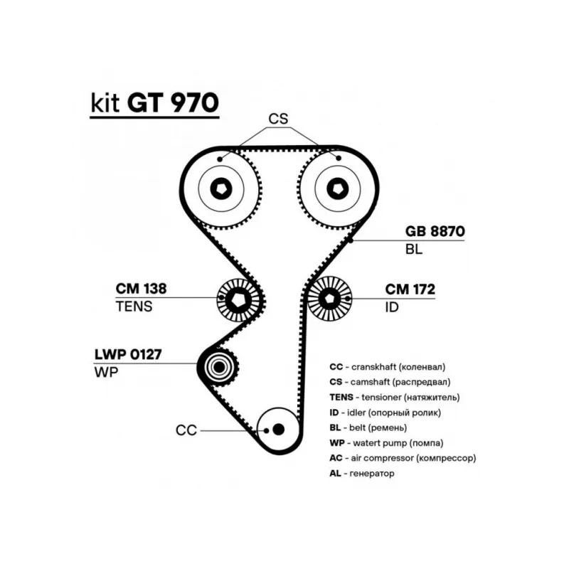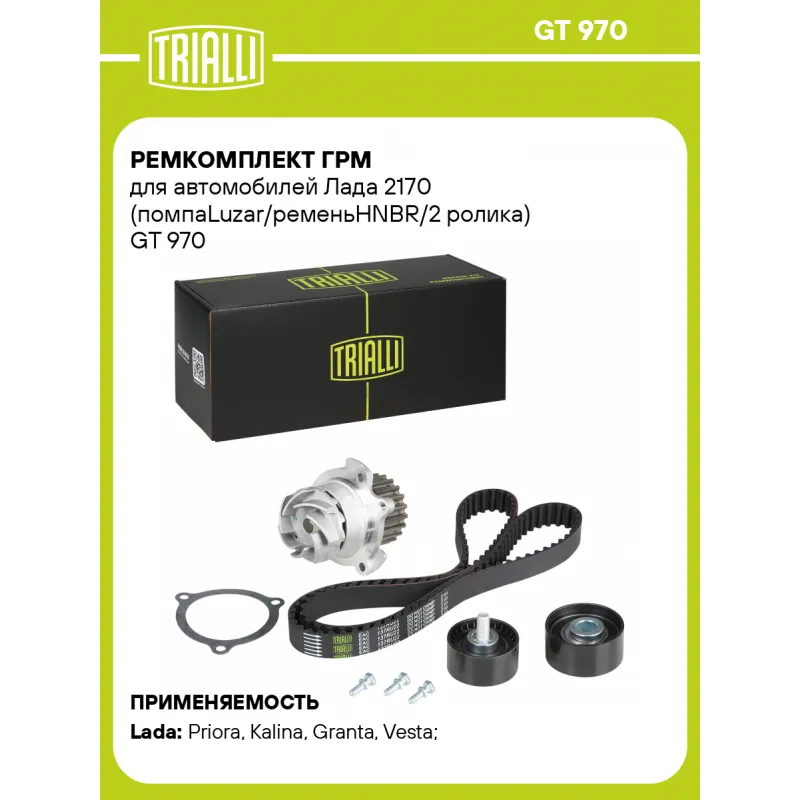 Ремкомплект ГРМ для автомобилей Лада 2170 (помпаLuzar/ременьHNBR/2 ролика) Характеристики: Артикул: GT 970 OEM номера: 21126-1006040, 137RU22, 5631X1, 21126-1006238, 21126-1006135, 21126-1006135-00, 21126-1006238-00, 21126-1006040-00, 21126-1006040-86, 21126-1307010, 21126-1307010-00, 21126-1307010-86, 21126-1307010-10, 21126-1307010-11, 21126-1307010-12 Сопутствующие товары:: GD 770, CM 172, CM 138, CMS 138, CMS172 Особенности конструкции:: с водяным насосом Гарантийный срок: 2 года/60 000 км. Ширина ремня ГРМ, мм.: 22 Количество зубьев ремня ГРМ: 137 Товарная линейка: BLACK Материал ремня ГРМ: HNBR Сопутствующий товар: Ролики ГРМ: CM 108; CM 120; CM 135; CMS 108; CMS 120; CMS 135 Подходит для авто: ВАЗ Priora (07-), Kalina (04-), Kalina (04-), Granta (10-), Priora (07-), Priora (07-), Vesta (15-), Kalina (04-), Granta (10-), X-Ray (15-) Для проверки применяемости отправьте VIN автомобиля через вкладку "Есть вопросы о товаре?" Комплектация: Ролик ГРМ опорный - 1 шт Водяной насос (помпа) - 1 шт Ролик ГРМ натяжной - 1 шт Ремень ГРМ - 1 шт Гарантия: от 1 года.