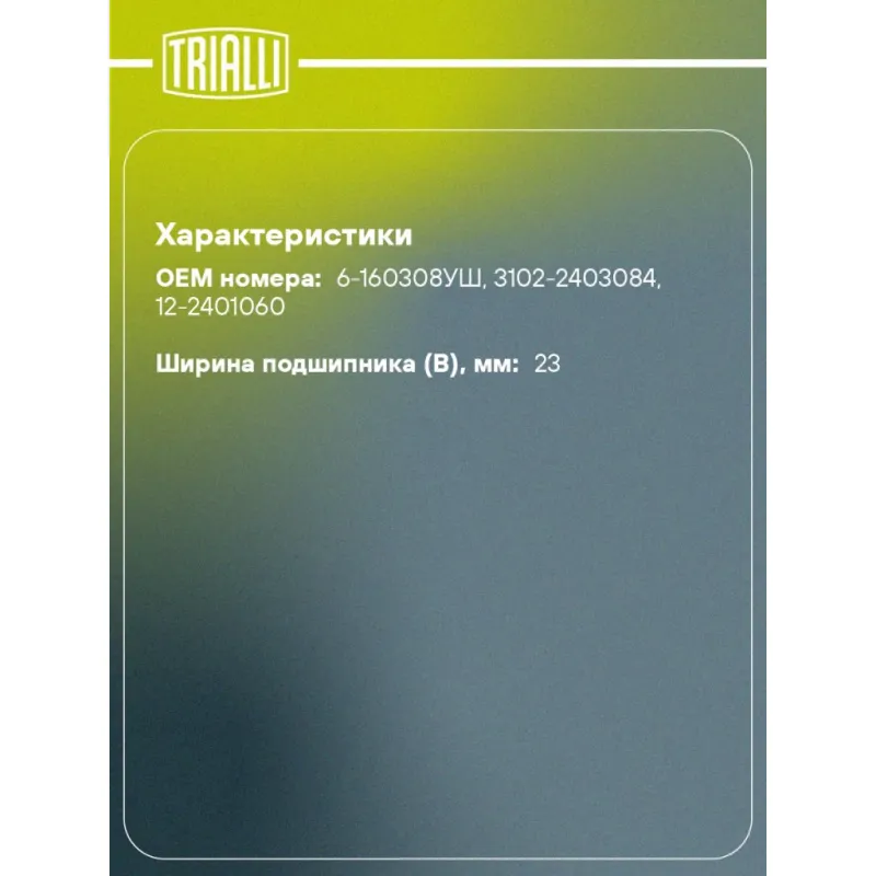 Ремкомплект полуоси для автомобиля ГАЗ 3110 Характеристики: Артикул: CS 738 OEM номера: 6-160308УШ, 3102-2403084, 12-2401060 Товарная линейка: BLACK Количество на автомобиль: 2 Сопутствующие товары:: CT 630,PT 401 Особенности конструкции:: шариковый однорядный Гарантийный срок: 1 год/30 000 км Наружный диаметр (D), мм: 90 Внутренний диаметр (d), мм: 40 Ширина подшипника (B), мм: 23 Подходит для авто: ГАЗ 3102, 3110, 31105 Для проверки применяемости отправьте VIN автомобиля через вкладку "Есть вопросы о товаре?" Комплектация: Подшипник полуоси для а/м ГАЗ 2410 6308-2RS/180308 - 1 шт Кольцо ГАЗ-24-31105 подшипника полуоси запорное - 1 шт Сальник ступицы для а/м ГАЗ 2410 - 1 шт Гарантия: от 1 года.