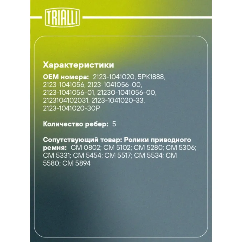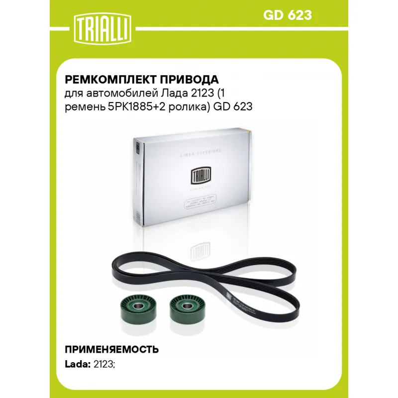 Ремкомплект привода для автомобилей Лада 2123 (1 ремень 5PK1885+2 ролика) Характеристики: Артикул: GD 623 OEM номера: 2123-1041020, 5PK1888, 2123-1041056, 2123-1041056-00, 2123-1041056-01, 21230-1041056-00, 2123104102031, 2123-1041020-33, 2123-1041020-30Р, 2123104102032, 21230104102082, 2123-104105610, 21230-1041056-10, 21230-1041056-01, 21230104106510, 2123-1041020-10, 2123-1041020-30, 21230-1041020-31-0 Количество ребер: 5 Длина ремня, мм.: 1888 Количество ремней в комплекте: 1 Количество роликов: 2 Товарная линейка: BLACK Количество на автомобиль: 1 Сопутствующие товары:: CM 123, 5PK1888, GD 624 Особенности конструкции:: для автомобилей без климатической установки (-A/C) Гарантийный срок: 2 года/60 000 км. Сопутствующий товар: Ролики приводного ремня: CM 0802; CM 5102; CM 5280; CM 5306; CM 5331; CM 5454; CM 5517; CM 5534; CM 5580; CM 5894 Подходит для авто: ВАЗ 2123 Для проверки применяемости отправьте VIN автомобиля через вкладку "Есть вопросы о товаре?" Комплектация: Ремень поликлиновой - 1 шт Ролик приводного ремня - 2 шт Гарантия: от 1 года.