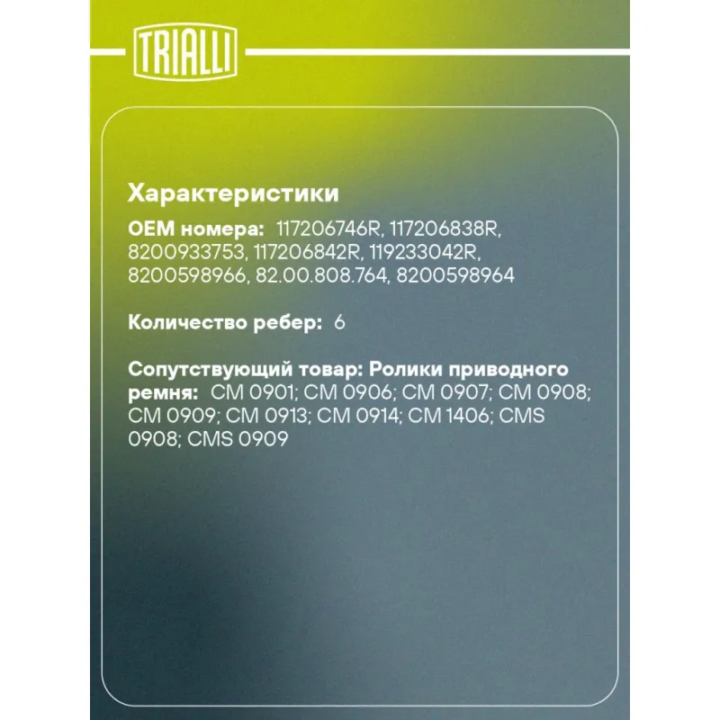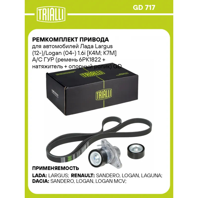 Ремкомплект привода для автомобилей Лада Largus (12-)/Logan (04-) 1.6i [К4M; К7M] A/C ГУР (ремень 6PK1822 + натяжитель + опорный ролик) Характеристики: Артикул: GD 717 OEM номера: 117206746R, 117206838R, 8200933753, 117206842R, 119233042R, 8200598966, 82.00.808.764, 8200598964 Особенности конструкции:: ремкомплект Количество ребер: 6 Длина ремня, мм.: 1822 Количество ремней в комплекте: 1 Количество роликов: 2 Гарантийный срок: 2 года/60 000 км. Товарная линейка: BLACK Количество на автомобиль: 1 Сопутствующий товар: Ролики приводного ремня: CM 0901; CM 0906; CM 0907; CM 0908; CM 0909; CM 0913; CM 0914; CM 1406; CMS 0908; CMS 0909 Комплектация: Ремень поликлиновой - 1 шт Ролик приводного ремня - 2 шт Гарантия: от 1 года.