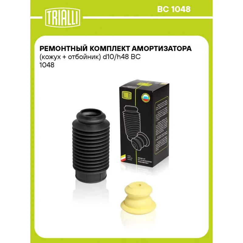 Ремонтный комплект амортизатора (кожух + отбойник) d10/h48 Характеристики: Артикул: BC 1048 OEM номера: 51722-SS0-004, 51722-TA5-A01, 51722-S10-004, GJ6A-34-111C, GS1D-34-111A, A 211 323 01 44, A 211 323 02 44, 2113230244, 2113230144, 55240-3M015, 55240-0M315, 55240-0M015, 55240-2F002, 55240-4U000, 55240-95F0A Товарная линейка: BLACK Количество на автомобиль: 2 Материал: TPV (Термопластичный вулканизат) Внутренний диаметр отбойника, мм: 10 Высота отбойника, мм: 48 Высота в сборе, мм: 195±5 Гарантийный срок: 2 года/60 000 км Дополнительная информация: Универсальный ремонтный комплект, подбор согласно ОЕМ номерам или по параметрам амортизатора. Комплектация: Отбойник (буфер) - 1 шт Пылезащитный кожух (пыльник) - 1 шт Гарантия: от 1 года.
