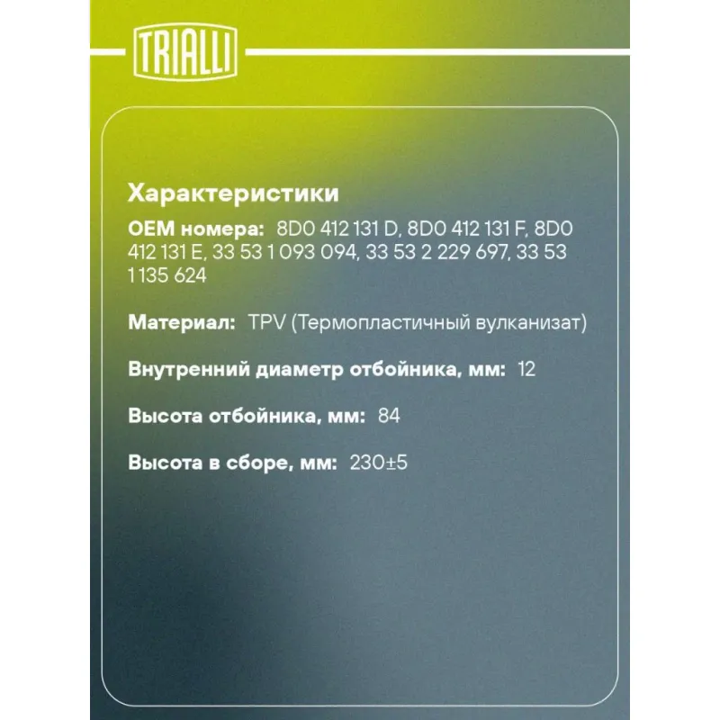 Ремонтный комплект амортизатора (кожух + отбойник) d12/h84 Характеристики: Артикул: BC 1284 OEM номера: 8D0 412 131 D, 8D0 412 131 F, 8D0 412 131 E, 33 53 1 093 094, 33 53 2 229 697, 33 53 1 135 624 Товарная линейка: BLACK Количество на автомобиль: 2 Материал: TPV (Термопластичный вулканизат) Внутренний диаметр отбойника, мм: 12 Высота отбойника, мм: 84 Высота в сборе, мм: 230±5 Гарантийный срок: 2 года/60 000 км Дополнительная информация: Универсальный ремонтный комплект, подбор согласно ОЕМ номерам или по параметрам амортизатора. Комплектация: Пылезащитный кожух (пыльник) - 1 шт Отбойник (буфер) - 1 шт Гарантия: от 1 года.