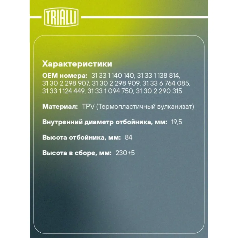 Ремонтный комплект амортизатора (кожух + отбойник) d19/h84 Характеристики: Артикул: BC 1984 OEM номера: 357 412 303 F, 357 412 303 E, 1K0 412 303 M, 1K0 412 303 G, 5Q0 412 303, 1K0 412 303 AA, 48331-02050, 54050-31U02, 54050-38U02, 55240-8H500, 31 33 1 140 140, 31 33 1 138 814, 31 30 2 298 907, 31 30 2 298 909, 31 33 6 764 085, 31 33 1 124 449, 31 33 1 094 750, 31 30 2 290 315, 31 33 6 771 352, 31 33 6 771 380, 31 30 3 411 973, 1K0 412 303 T, 540500006R, 51722-SWE-T01 Товарная линейка: BLACK Количество на автомобиль: 2 Материал: TPV (Термопластичный вулканизат) Внутренний диаметр отбойника, мм: 19,5 Высота отбойника, мм: 84 Высота в сборе, мм: 230±5 Гарантийный срок: 2 года/60 000 км Дополнительная информация: Универсальный ремонтный комплект, подбор согласно ОЕМ номерам или по параметрам амортизатора. Комплектация: Пылезащитный кожух (пыльник) - 1 шт Отбойник (буфер) - 1 шт Гарантия: от 1 года.