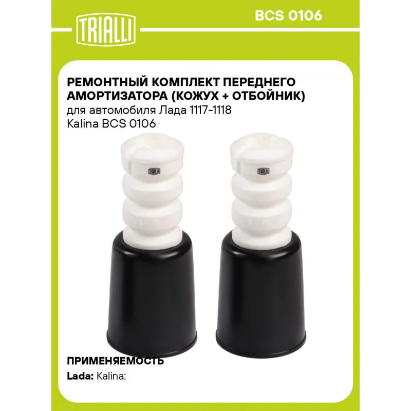 Ремонтный комплект переднего амортизатора (кожух + отбойник) для автомобиля Лада 1117-1118 Kalina Характеристики: Артикул: BCS 0106 OEM номера: 1118-2902816, 11180-2902816-00, 11180-2902812-01, 11180-2902812-00, 1118-2902812 Товарная линейка: BLACK Количество на автомобиль: 1 Материал: Пенополиуретан/Пластик Внутренний диаметр отбойника, мм: 24 Высота отбойника, мм: 100 Гарантийный срок: 2 года/60 000 км Подходит для авто: ВАЗ Kalina (04-), Kalina (04-) Для проверки применяемости отправьте VIN автомобиля через вкладку "Есть вопросы о товаре?" Комплектация: Отбойник (буфер) - 2 шт Пылезащитный кожух (пыльник) - 1 шт Гарантия: от 1 года.