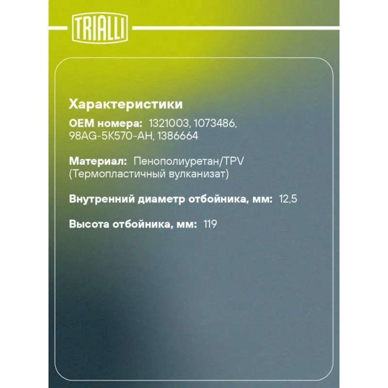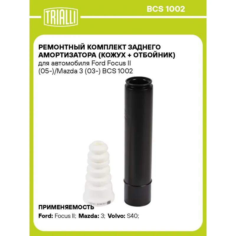 Ремонтный комплект заднего амортизатора (кожух + отбойник) для автомобиля Ford Focus II (05-)/Mazda 3 (03-) Характеристики: Артикул: BCS 1002 OEM номера: 1321003, 1073486, 98AG-5K570-AH, 1386664 Товарная линейка: BLACK Количество на автомобиль: 2 Материал: Пенополиуретан/TPV (Термопластичный вулканизат) Внутренний диаметр отбойника, мм: 12,5 Высота отбойника, мм: 119 Гарантийный срок: 2 года/60 000 км Подходит для авто: Ford Focus II (05-) Mazda 3 (03-), 3 (03-) Volvo S40 (04-), S40 (04-) Для проверки применяемости отправьте VIN автомобиля через вкладку "Есть вопросы о товаре?" Комплектация: Отбойник (буфер) - 1 шт Пылезащитный кожух (пыльник) - 1 шт Гарантия: от 1 года.