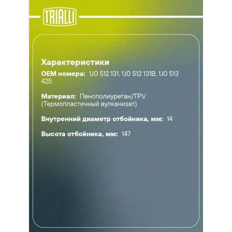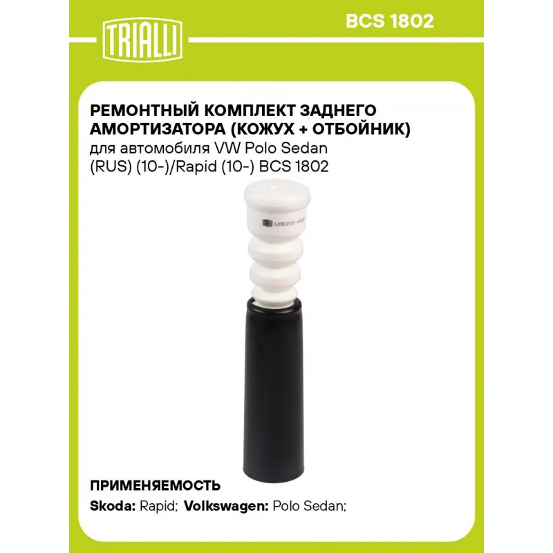 Ремонтный комплект заднего амортизатора (кожух + отбойник) для автомобиля VW Polo Sedan (RUS) (10-)/Rapid (10-) Характеристики: Артикул: BCS 1802 OEM номера: 1J0 512 131, 1J0 512 131B, 1J0 513 425 Товарная линейка: BLACK Количество на автомобиль: 2 Материал: Пенополиуретан/TPV (Термопластичный вулканизат) Внутренний диаметр отбойника, мм: 14 Высота отбойника, мм: 147 Гарантийный срок: 2 года/60 000 км Подходит для авто: Skoda Rapid (12-), Rapid (12-) Volkswagen Polo Sedan (RUS) (10-), Polo Sedan (RUS) (10-) Для проверки применяемости отправьте VIN автомобиля через вкладку "Есть вопросы о товаре?" Комплектация: Пылезащитный кожух (пыльник) - 1 шт Отбойник (буфер) - 1 шт Гарантия: от 1 года.