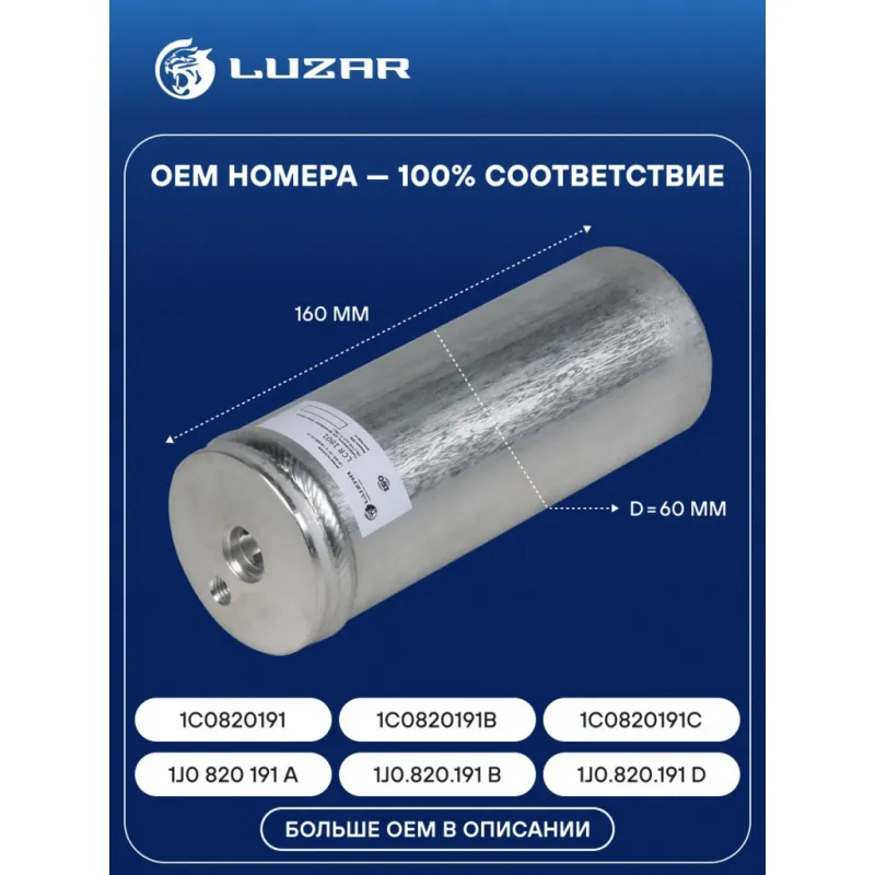 Ресивер-осушитель конденсора для автомобилей Octavia (96-)/VW Golf IV (96-) Характеристики: Артикул: LCR 1801 OEM номера: 1J0 820 191 A, 1J0.820.191 B, 1J0.820.191 D, 1C0820191, 1C0820191C, 1C0820191B, 1JO.820.191 D Материал: Алюминий Диаметр: 60 Высота: 160 Хладагент: R-134a Сопутствующий товар: Радиаторы кондиционера (конденсеры): LRAC 18J0 Сопутствующий товар: Электровентиляторы кондиционера: LFAC 1804; LFAC 18J0 Сопутствующий товар: Компрессоры кондиционера: LCAC 1810; LCAC 1814 Сопутствующий товар: Клапаны расширительные кондиционера (ТРВ): LTRV 1879 Совместимость с радиаторами кондиционера LUZAR: Несовместим Подходит для авто: Audi A3 (96-), A3 (96-), TT (98-) Volkswagen Golf IV (97-), Bora (99-), Bora (99-), Golf IV (97-), Bora (99-) Skoda Octavia (96-), Octavia (96-) Seat Leon (99-), Ibiza (93-) Для проверки применяемости отправьте VIN автомобиля через вкладку "Есть вопросы о товаре?" Комплектация: Ресивер - осушитель Гарантия: от 1 года.
