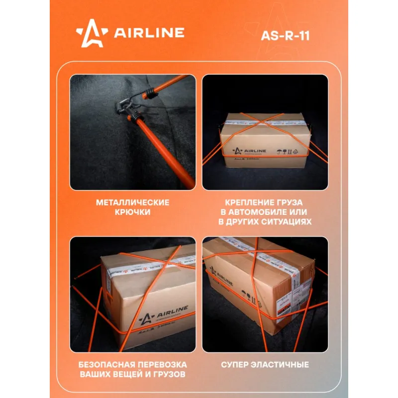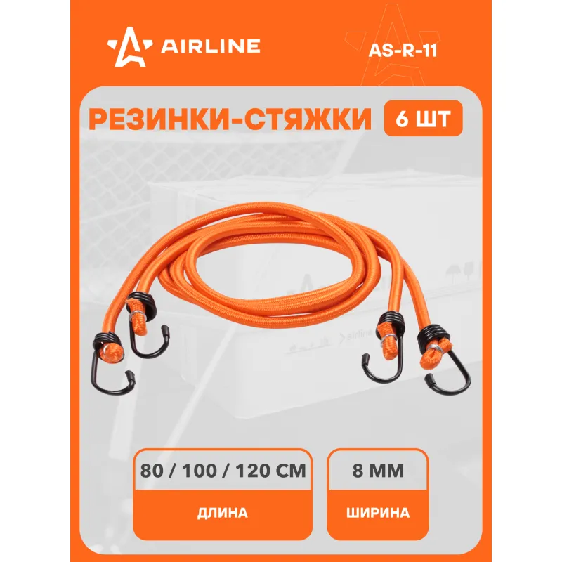 Резинки-стяжки набор 6 шт.: 2 шт.-80см, 2шт.-100см, 2шт-120см, D-8 мм, (метал. крючки) Описание: Набор эластичных резинок представляет собой универсальное решение для надежного крепления груза в автомобиле или в других местах, где необходимо обеспечить безопасность перевозимых предметов. Фиксация этих резинок производится с помощью металлических крючков, которые оборудованы пластиковыми наконечниками для более надежной фиксации и защиты от повреждений. В комплекте 6 штук резинок разной длины: 2 штуки по 80 см, 2 штуки по 100 см и 2 штуки по 120 см, с диаметром 8 мм. Этот разнообразный выбор длин позволяет вам создавать конструкции с разными размерами, исходя из ваших потребностей при перевозке груза. С помощью данного набора резинок вы можете легко и надежно удерживать груз в салоне и багажнике автомобиля, а также создавать конструкции в виде сетки для предотвращения перемещения груза во время движения. Эти эластичные резинки с металлическими крючками обеспечивают надежное крепление и безопасность перевозки. Особенности: -Долгий срок службы; -Супер эластичный; -Универсальное надежное крепление; -Качественный пластик; Важно отметить, что ремни НЕ ПРЕДНАЗНАЧЕНЫ ДЛЯ ПОДЪЕМА грузов. Товар официального производителя AIRLINE. Набор идеально подойдет в качестве подарка автомобилисту, мужчине, мужу, жене, парню, владельцу авто. Характеристики: Артикул: AS-R-11 Диаметр стяжки, мм: 8 Кол-во резинок-стяжек, шт: 6 Крепление: Металлические крючки Длина 1, см: 80 Длина 2, см: 100 Длина 3, см: 120 Комплектация: Резинки-стяжки набор с металлическими крючками - 6 шт Пакет с навершием - 1 шт Гарантия: от 1 года.