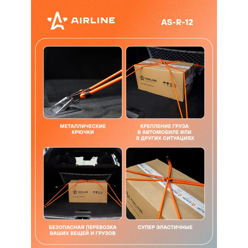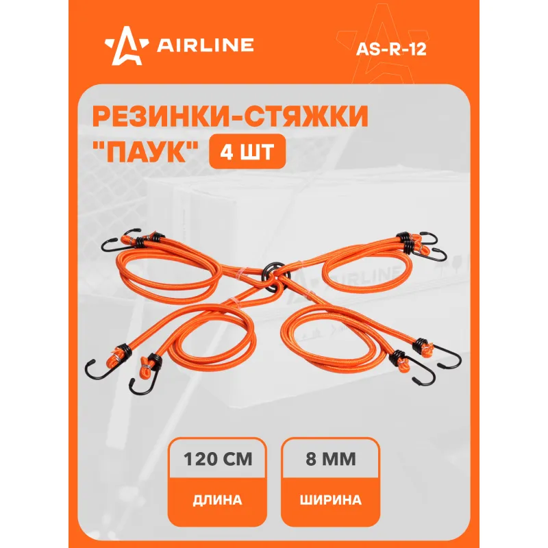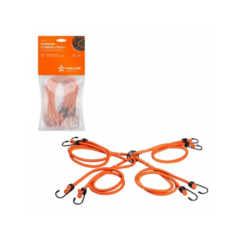 Резинки-стяжки набор "Паук" 4шт.-120 см, D-8 мм (металлические крючки) Описание: Набор эластичных резинок Паук - это удобное и многофункциональное решение для надежного крепления груза в автомобиле или в других ситуациях. Фиксация резинок производится с использованием металлических крючков с пластиковыми наконечниками, что обеспечивает надежное соединение и защиту от повреждений. В этом наборе 4 шт резинки длиной . Кроме того, резинки Паук имеют уникальную возможность соединяться между собой с помощью кольца, создавая подобие паутины. Это позволяет вам создавать сложные конструкции для фиксации и удержания груза различных размеров и форм. Эти многоцелевые резинки с металлическими крючками и возможностью соединения обеспечивают максимальную гибкость при перевозке груза, делая их идеальным аксессуаром для автомобильного багажа, спортивных мероприятий, путешествий и многих других ситуаций, где необходимо надежное крепление. Особенности: -Долгий срок службы; -Супер эластичный; -Универсальное надежное крепление; -Качественный пластик; Важно отметить, что резинки НЕ ПРЕДНАЗНАЧЕН ДЛЯ ПОДЪЕМА грузов. Товар официального производителя AIRLINE. Набор идеально подойдет в качестве подарка автомобилисту, мужчине, мужу, жене, парню, владельцу авто. Характеристики: Артикул: AS-R-12 Длина, см: 120 Диаметр стяжки, мм: 8 Кол-во резинок-стяжек, шт: 4 Крепление: Металлические крючки Комплектация: Резинки-стяжки набор с металлическими крючками в пакете с навершием - 4 шт Пакет с навершием - 1 шт Пластиковое кольцо - 1 шт Гарантия: от 1 года.