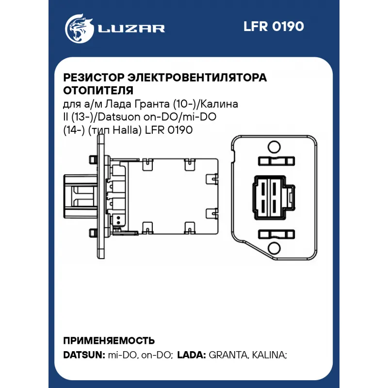 Резистор электровентилятора отопителя для а/м Лада Гранта (10-)/Калина II (13-)/Datsuon on-DO/mi-DO (14-) (тип Halla) Характеристики: Артикул: LFR 0190 OEM номера: 21900811802200, 21900812702510 Сопутствующий товар: Электровентиляторы отопителя: LFh 01270 Количество на автомобиль: 1 Комплектация: Резистор электровентилятора - 1 шт Гарантия: от 1 года.