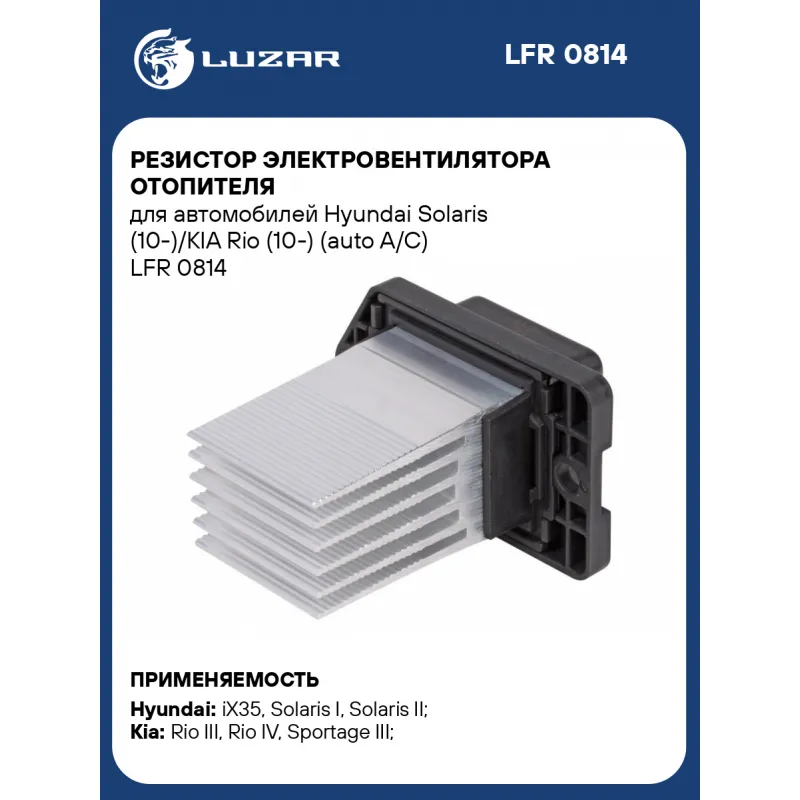 Резистор электровентилятора отопителя для автомобилей Hyundai Solaris (10-)/KIA Rio (10-) (auto A/C) Характеристики: Артикул: LFR 0814 OEM номера: 97179-2J000 Количество на автомобиль: 1 Сопутствующий товар: Электровентиляторы отопителя: LFh 0820; LFh 08L4; LFh 08M1; LFh 08Y0 Напряжение: 12V Мощность, Вт: 30-60 Подходит для авто: Hyundai iX35 (10-), Solaris I (10-), Solaris II (17-), iX35 (10-) Kia Rio III (11-), Rio IV (17-), Rio IV (17-), Sportage III (10-), Mohave (08-) Для проверки применяемости отправьте VIN автомобиля через вкладку "Есть вопросы о товаре?" Комплектация: Резистор электровентилятора - 1 шт Гарантия: от 1 года.