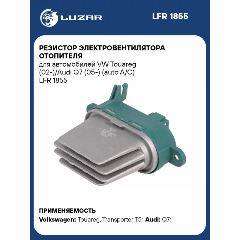 Резистор электровентилятора отопителя для автомобилей VW Touareg (02-)/Audi Q7 (05-) (auto A/C) Характеристики: Артикул: LFR 1855 OEM номера: 7L0907521A, 7L0907521B Количество на автомобиль: 1 Сопутствующий товар: Электровентиляторы отопителя: LFh 1801; LFh 1855; LFh 1856; LFh 18H8; LFh 18K1; LFh 18K2 Напряжение: 12V Мощность, Вт: 30-60 Подходит для авто: Volkswagen Touareg (02-), Transporter T5 (03-), Multivan (03-), Amarok (09-), Transporter T5 (03-), Amarok (09-) Audi Q7 (06-) Для проверки применяемости отправьте VIN автомобиля через вкладку "Есть вопросы о товаре?" Комплектация: Резистор электровентилятора - 1 шт Гарантия: от 1 года.