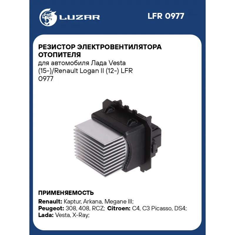 Резистор электровентилятора отопителя для автомобиля Лада Vesta (15-)/Renault Logan II (12-) Характеристики: Артикул: LFR 0977 OEM номера: 8450039719, 7701209850, 6441.FB, 245R1623F8ZW, 272006925R, 6441.AA Количество на автомобиль: 1 Сопутствующий товар: Электровентиляторы отопителя: LFh 0902; LFh 0978; LFh 0980; LFh 2080; LFh 2090 Напряжение: 12V Мощность, Вт: 30-60 Подходит для авто: Renault Kaptur (16-), Arkana (19-), Megane III (08-), Scenic III (09-), Logan II (12-), Megane III (08-) Peugeot 308 (07-), 308 (07-), 408 (10-), RCZ (10-), 308 (07-) Citroen C4 (10-), C4 (10-), C3 Picasso (09-), DS4 (11-), DS4 (11-) ВАЗ Vesta (15-), Vesta (15-), X-Ray (15-) Для проверки применяемости отправьте VIN автомобиля через вкладку "Есть вопросы о товаре?" Комплектация: Резистор электровентилятора - 1 шт Гарантия: от 1 года.