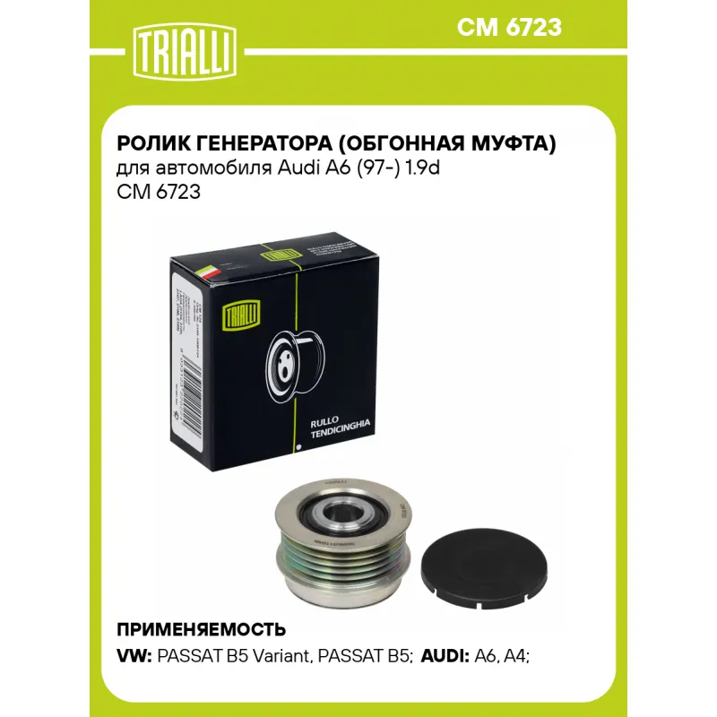 Ролик генератора (обгонная муфта) для автомобиля Audi A6 (97-) 1.9d Характеристики: Артикул: CM 6723 OEM номера: 028 903 119 AN, 028 903 119 T, 535 0004 10 Гарантийный срок: 1 год/30 000 км. Количество на автомобиль: 1 Комплектация: Ролик приводного ремня (генератора) - 1 шт Гарантия: от 1 года.