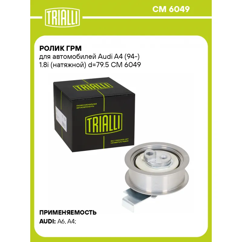 Ролик ГРМ для автомобилей Audi A4 (94-) 1.8i (натяжной) d=79.5 Характеристики: Артикул: CM 6049 OEM номера: 06A109243A Ширина, мм: 28.5 Внешний диаметр, мм: 79.5 Внутренний диаметр, мм: 8.2 Гарантийный срок: 2 года/60 000 км. Сопутствующий товар: Ролики ГРМ: CM 5053 Количество на автомобиль: 1 Материал: Комбинированный Товарная ... Читать полностью →