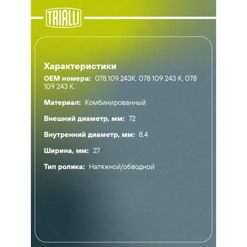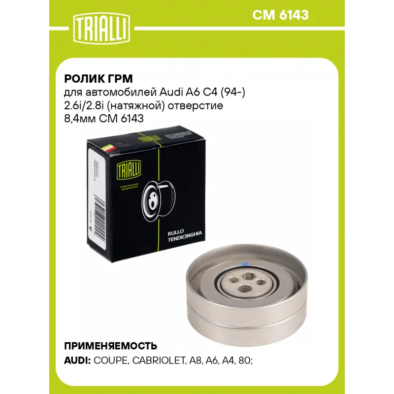 Ролик ГРМ для автомобилей Audi A6 C4 (94-) 2.6i/2.8i (натяжной) отверстие 8,4мм Характеристики: Артикул: CM 6143 OEM номера: 078.109.243K, 078 109 243 K, 078 109 243 K. Гарантийный срок: 2 года/60 000 км. Сопутствующий товар: Ролики ГРМ: CM 5524 Количество на автомобиль: 1 Материал: Комбинированный Внешний диаметр, мм: 72 Внутренний диаметр, мм: 8.4 Ширина, мм: 27 Товарная линейка: BLACK Комплектация: Ролик ГРМ - 1 шт Гарантия: от 1 года.