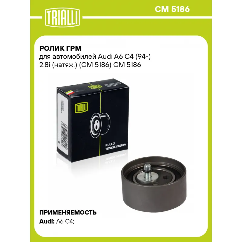 Ролик ГРМ для автомобилей Audi A6 C4 (94-) 2.8i (натяж.) (CM 5186) Характеристики: Артикул: CM 5186 OEM номера: 078109243S, 078109243R, 078109243Q Сопутствующий товар: Ролики ГРМ: CM 6042, CM 5187 Количество на автомобиль: 1 Материал: металл/пластик Внешний диаметр, мм: 72 Гарантийный срок: 2 года/60 000 км. Внутренний диаметр, мм: 8 Ширина, мм: 32.5 Тип ролика: ГРМ Товарная линейка: BLACK Подходит для авто: Audi A6 C4 (94-) Для проверки применяемости отправьте VIN автомобиля через вкладку "Есть вопросы о товаре?" Комплектация: Ролик ГРМ - 1 шт Гарантия: от 1 года.