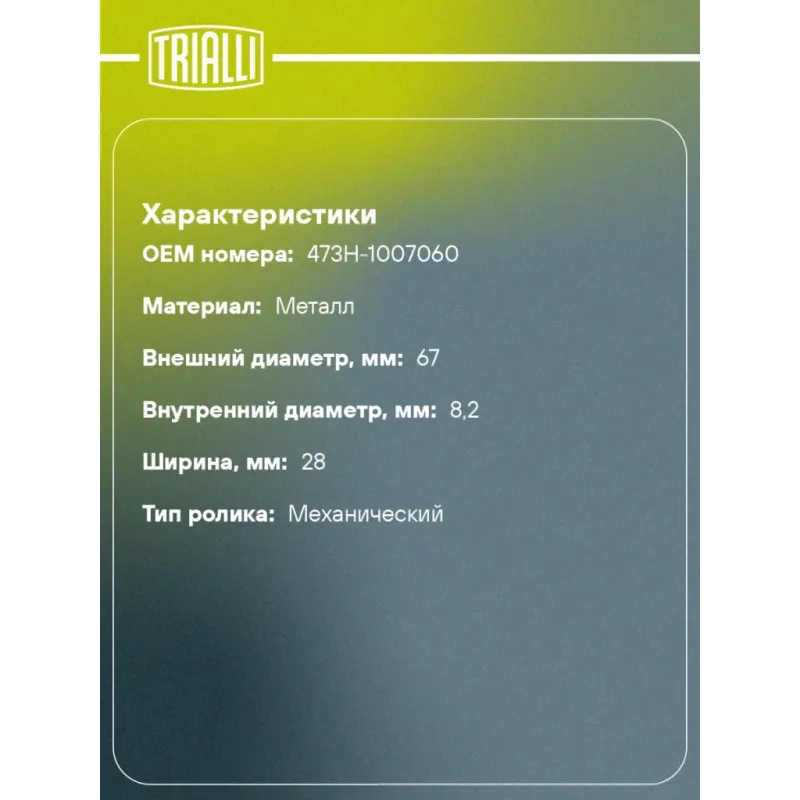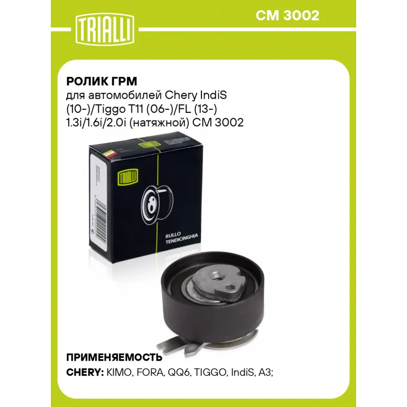 Ролик ГРМ для автомобилей Chery IndiS (10-)/Tiggo T11 (06-)/FL (13-) 1.3i/1.6i/2.0i (натяжной) Характеристики: Артикул: CM 3002 OEM номера: 473H-1007060 Сопутствующий товар: Ролики ГРМ: CM 3077 Количество на автомобиль: 1 Материал: металл Внешний диаметр, мм: 67 Гарантийный срок: 2 года/60 000 км. Внутренний диаметр, мм: 8,2 Ширина, мм: 28 Тип ролика: механический Товарная линейка: BLACK Комплектация: Ролик ГРМ - 1 шт Гарантия: от 1 года.