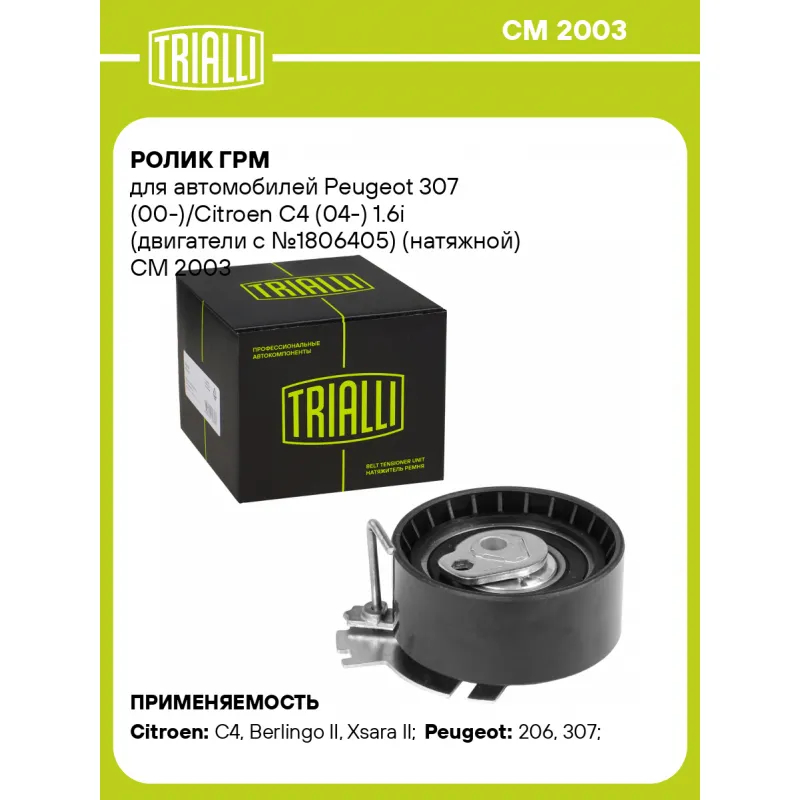 Ролик ГРМ для автомобилей Peugeot 307 (00-)/Citroen C4 (04-) 1.6i (двигатели с №1806405) (натяжной) Характеристики: Артикул: CM 2003 OEM номера: 0829A0, 9648704380, 0829.F6, 0829C8 Особенности конструкции:: CM 6188 Гарантийный срок: 2 года/60 000 км. Сопутствующий товар: Ролики ГРМ: CM 6188 Количество на автомобиль: 1 Внешний диаметр, мм: 70 Внутренний диаметр, мм: 8 Ширина, мм: 30 Тип ролика: натяжной Товарная линейка: BLACK Подходит для авто: Citroen C4 (04-), Berlingo II (08-), Xsara II (00-) Peugeot 206 (00-), 307 (00-) Для проверки применяемости отправьте VIN автомобиля через вкладку "Есть вопросы о товаре?" Комплектация: Ролик ГРМ - 1 шт Гарантия: от 1 года.