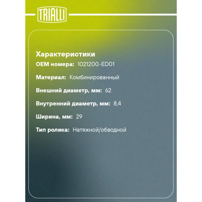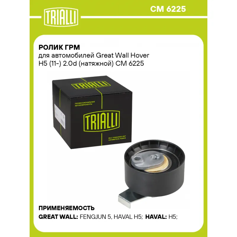 Ролик ГРМ для автомобилей Great Wall Hover H5 (11-) 2.0d (натяжной) Характеристики: Артикул: CM 6225 OEM номера: 1021200-ED01 Ширина, мм: 29 Внешний диаметр, мм: 62 Внутренний диаметр, мм: 8,4 Гарантийный срок: 2 года/60 000 км. Количество на автомобиль: 1 Материал: Комбинированный Товарная линейка: BLACK Комплектация: Ролик ... Читать полностью →