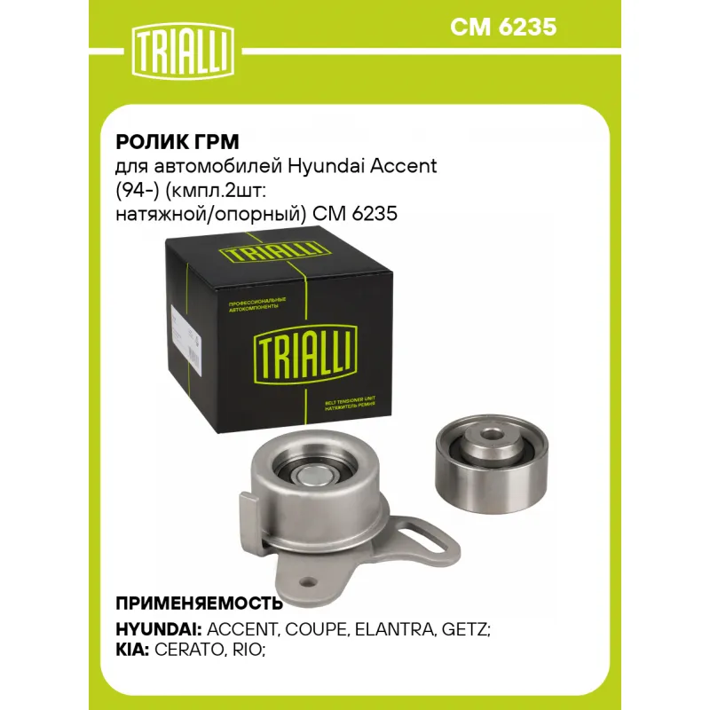 Ролик ГРМ для автомобилей Hyundai Accent (94-) (кмпл.2шт: натяжной/опорный) Характеристики: Артикул: CM 6235 OEM номера: 24410-21014 , 24410-22000, 24410-22020, 24410-21010, 24810-26010, 24410-26000, 24810-26020, MD030605 Гарантийный срок: 2 года/60 000 км. Количество на автомобиль: 1 Материал: Комбинированный Товарная линейка: BLACK Комплектация: Ролики ГРМ - 2 шт Гарантия: от 1 года.
