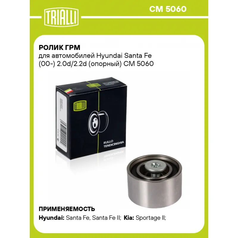 Ролик ГРМ для автомобилей Hyundai Santa Fe (00-) 2.0d/2.2d (опорный) Характеристики: Артикул: CM 5060 OEM номера: 24810-27000, 24810-27250 Сопутствующий товар: Ролики ГРМ: CM 5201 Количество на автомобиль: 1 Материал: металл/пластик Внешний диаметр, мм: 58 Гарантийный срок: 2 года/60 000 км. Внутренний диаметр, мм: 10 Ширина, мм: 32 Тип ролика: ГРМ Товарная линейка: BLACK Подходит для авто: Hyundai Santa Fe (00-), Santa Fe II (06-), Tucson I (04-) Kia Sportage II (04-) Для проверки применяемости отправьте VIN автомобиля через вкладку "Есть вопросы о товаре?" Комплектация: Ролик ГРМ - 1 шт Гарантия: от 1 года.