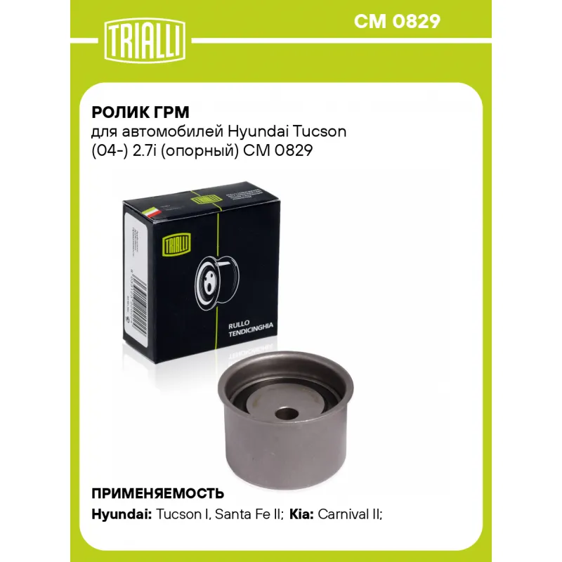 Ролик ГРМ для автомобилей Hyundai Tucson (04-) 2.7i (опорный) Характеристики: Артикул: CM 0829 OEM номера: 24810-37120, 2481037100 Сопутствующий товар: Ролики ГРМ: CM 5069, CM 5311 Количество на автомобиль: 1 Материал: металл Внешний диаметр, мм: 57.5 Гарантийный срок: 2 года/60 000 км. Внутренний диаметр, мм: 10,2 Ширина, мм: 39 Тип ролика: механический Товарная линейка: BLACK Подходит для авто: Hyundai Tucson I (04-), Santa Fe II (06-), Sonata V (NF) (05-) Kia Carnival II (06-) Для проверки применяемости отправьте VIN автомобиля через вкладку "Есть вопросы о товаре?" Комплектация: Ролик ГРМ - 1 шт Гарантия: от 1 года.